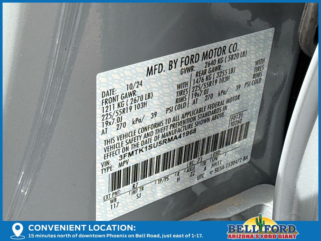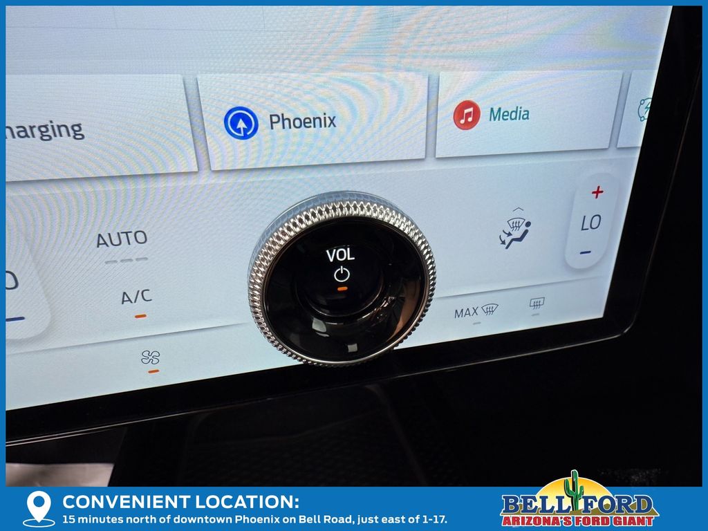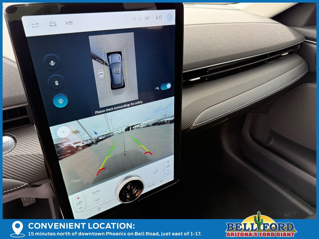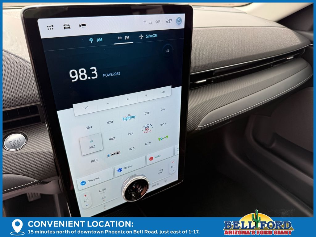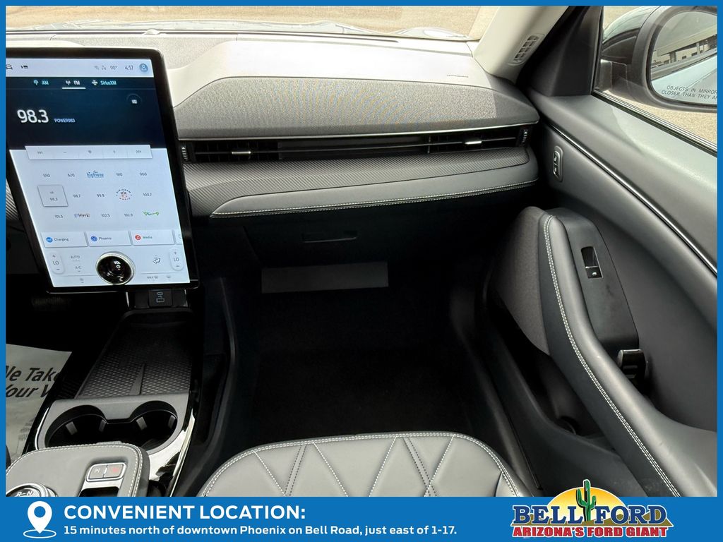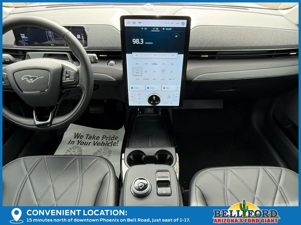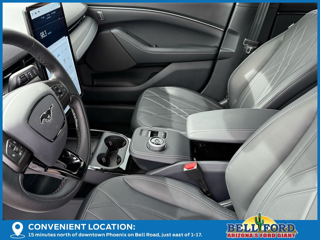 This Ford Mustang Mach-E is equipped with the following options: Equipment Group 100A, 4-Wheel Disc Brakes, 6 Speakers, ABS brakes, ActiveX Bucket Seats, Air Conditioning, Alloy wheels, AM/FM radio: SiriusXM with 360L, AM/FM Stereo, Apple CarPlay/Android Auto, Auto High-beam Headlights, Auto-dimming Rear-View mirror, Automatic temperature control, Axle Ratio: 9.791, Brake assist, Bumpers: body-color, Compass, Delay-off headlights, Driver door bin, Driver vanity mirror, Dual front impact airbags, Dual front side impact airbags, Electronic Stability Control, Emergency communication system: 911 Assist, Exterior Parking Camera Rear, Four wheel independent suspension, Front anti-roll bar, Front Bucket Seats, Front Center Armrest, Front dual zone A/C, Front License Plate Bracket, Front reading lights, Fully automatic headlights, Garage door transmitter, Heated door mirrors, Illuminated entry, Knee airbag, Low tire pressure warning, Navigation system: Connected Navigation, Occupant sensing airbag, Outside temperature display, Overhead airbag, Overhead console, Panic alarm, Passenger door bin, Passenger vanity mirror, Power door mirrors, Power driver seat, Power steering, Power windows, Radio data system, Rain sensing wipers, Rear anti-roll bar, Rear seat center armrest, Rear side impact airbag, Rear window defroster, Rear window wiper, Remote keyless entry, Security system, SiriusXM Radio w/360L, Speed control, Speed-sensing steering, Speed-Sensitive Wipers, Split folding rear seat, Spoiler, Steering wheel mounted audio controls, SYNC 4A w/Enhanced Voice Recognition, Telescoping steering wheel, Tilt steering wheel, Traction control, Trip computer, Turn signal indicator mirrors, Variably intermittent wipers, and Wheels: 19" Machined-Face Aluminum.