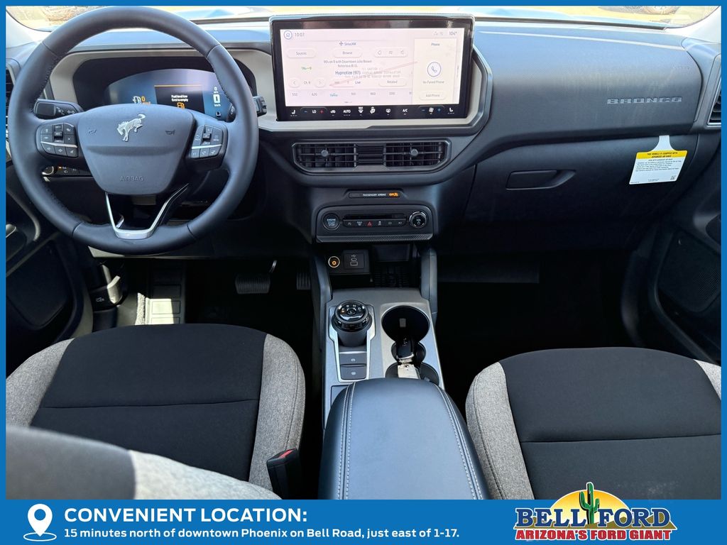 This Ford Bronco Sport is equipped with the following options: Black Diamond Off-Road Package (110V/400W AC Power Outlet, 2nd Row Carpeted Seatback, Auxiliary Switches & Wiring, Brush Guard, Cargo Management System (Shelf/Divider/Table), Cargo Mat, Class II Trailer Tow Pack w/Trailer Sway Control, Fender Tie Downs, Front & Rear Black Bumpers, Interior Grab Handle, Recovery Hooks, and Wheels: 17" Carbonized Gray Painted Aluminum), Convenience Package (Front Driver/Passenger Seat Back Map Pockets, Heated 8-Way Power Driver's Seat, LED Fog Lamps, Premium Wrapped Steering Wheel, and Universal Garage Door Opener (UGDO)), Equipment Group 200A, 4-Wheel Disc Brakes, 6 Speakers, ABS brakes, Air Conditioning, Alloy wheels, AM/FM radio: SiriusXM, AM/FM Stereo, Auto High-beam Headlights, Automatic temperature control, Brake assist, Cloth w/Easy-to-Clean Front Bucket Seats, Compass, Delay-off headlights, Driver door bin, Driver vanity mirror, Dual front impact airbags, Dual front side impact airbags, Electronic Stability Control, Emergency communication system: SYNC 4 911 Assist, Four wheel independent suspension, Front anti-roll bar, Front Bucket Seats, Front Center Armrest, Front reading lights, Fully automatic headlights, Heated door mirrors, Illuminated entry, Knee airbag, Low tire pressure warning, Occupant sensing airbag, Outside temperature display, Overhead airbag, Overhead console, Panic alarm, Passenger door bin, Passenger vanity mirror, Power door mirrors, Power steering, Power windows, Radio data system, Rear anti-roll bar, Rear Parking Sensors, Rear reading lights, Rear seat center armrest, Rear window defroster, Rear window wiper, Remote keyless entry, Security system, SiriusXM, Speed control, Speed-sensing steering, Speed-Sensitive Wipers, Split folding rear seat, Steering wheel mounted audio controls, SYNC 4 w/Enhanced Voice Recognition, Tachometer, Telescoping steering wheel, Tilt steering wheel, Traction control, Trip computer, Variably intermittent wipers, and Wheels: 17" Carbonized Gray-Painted Aluminum. Price includes: $1000 - Bonus Customer Cash. Exp. 01/05/2026 $500 - Retail Bonus Cash. Exp. 01/05/2026