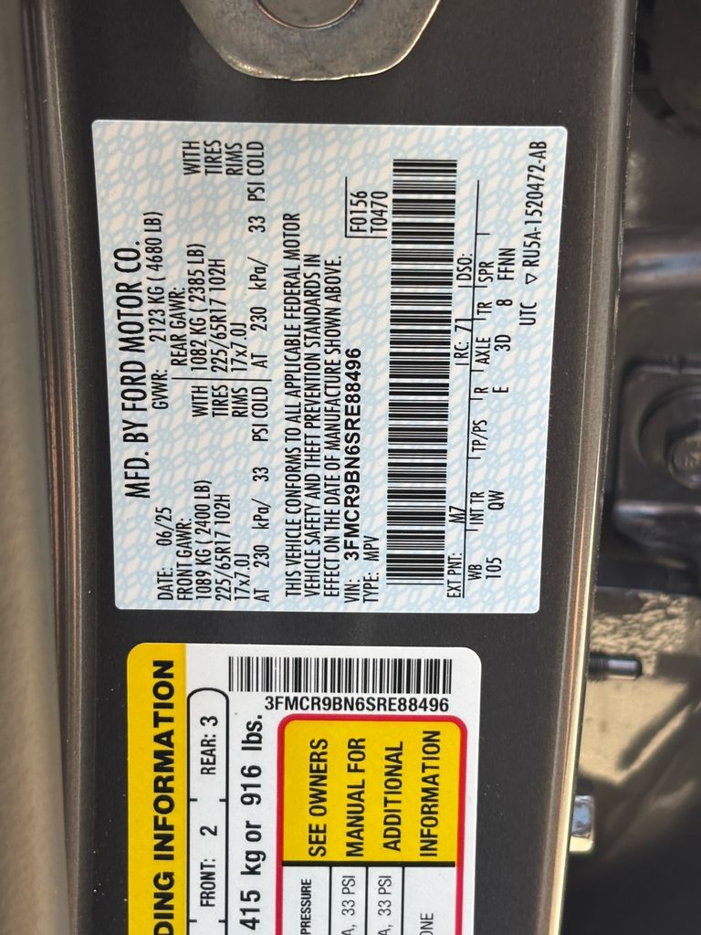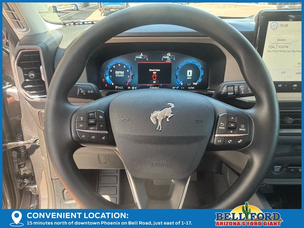 This Ford Bronco Sport is equipped with the following options: Equipment Group 200A, 4-Wheel Disc Brakes, 6 Speakers, ABS brakes, Air Conditioning, Alloy wheels, AM/FM radio: SiriusXM, AM/FM Stereo, Auto High-beam Headlights, Automatic temperature control, Brake assist, Cloth w/Easy-to-Clean Front Bucket Seats, Compass, Delay-off headlights, Driver door bin, Driver vanity mirror, Dual front impact airbags, Dual front side impact airbags, Electronic Stability Control, Emergency communication system: SYNC 4 911 Assist, Four wheel independent suspension, Front anti-roll bar, Front Bucket Seats, Front Center Armrest, Front License Plate Bracket, Front reading lights, Fully automatic headlights, Heated door mirrors, Illuminated entry, Knee airbag, Low tire pressure warning, Occupant sensing airbag, Outside temperature display, Overhead airbag, Overhead console, Panic alarm, Passenger door bin, Passenger vanity mirror, Power door mirrors, Power steering, Power windows, Radio data system, Rear anti-roll bar, Rear Parking Sensors, Rear reading lights, Rear seat center armrest, Rear window defroster, Rear window wiper, Remote keyless entry, Security system, SiriusXM, Speed control, Speed-sensing steering, Speed-Sensitive Wipers, Split folding rear seat, Steering wheel mounted audio controls, SYNC 4 w/Enhanced Voice Recognition, Tachometer, Telescoping steering wheel, Tilt steering wheel, Traction control, Trip computer, Variably intermittent wipers, and Wheels: 17" Carbonized Gray-Painted Aluminum. Price includes: $1000 - Bonus Customer Cash. Exp. 01/05/2026 $500 - Retail Bonus Cash. Exp. 01/05/2026