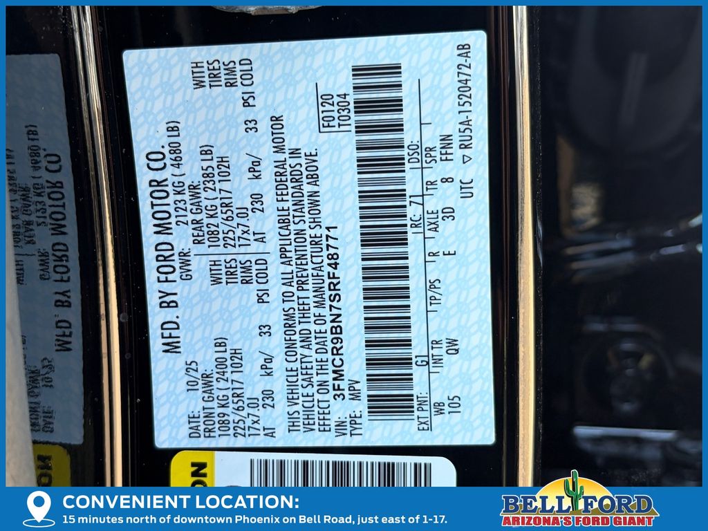 This Ford Bronco Sport is equipped with the following options: Black Diamond Off-Road Package (110V/400W AC Power Outlet, 2nd Row Carpeted Seatback, Auxiliary Switches & Wiring, Brush Guard, Cargo Management System (Shelf/Divider/Table), Cargo Mat, Class II Trailer Tow Pack w/Trailer Sway Control, Fender Tie Downs, Front & Rear Black Bumpers, Interior Grab Handle, Recovery Hooks, and Wheels: 17" Carbonized Gray Painted Aluminum), Equipment Group 200A, 4-Wheel Disc Brakes, 6 Speakers, ABS brakes, Air Conditioning, Alloy wheels, AM/FM radio: SiriusXM, AM/FM Stereo, Auto High-beam Headlights, Automatic temperature control, Brake assist, Cloth w/Easy-to-Clean Front Bucket Seats, Compass, Delay-off headlights, Driver door bin, Driver vanity mirror, Dual front impact airbags, Dual front side impact airbags, Electronic Stability Control, Emergency communication system: SYNC 4 911 Assist, Four wheel independent suspension, Front anti-roll bar, Front Bucket Seats, Front Center Armrest, Front reading lights, Fully automatic headlights, Heated door mirrors, Illuminated entry, Knee airbag, Low tire pressure warning, Occupant sensing airbag, Outside temperature display, Overhead airbag, Overhead console, Panic alarm, Passenger door bin, Passenger vanity mirror, Power door mirrors, Power steering, Power windows, Radio data system, Rear anti-roll bar, Rear Parking Sensors, Rear reading lights, Rear seat center armrest, Rear window defroster, Rear window wiper, Remote keyless entry, Security system, SiriusXM, Speed control, Speed-sensing steering, Speed-Sensitive Wipers, Split folding rear seat, Steering wheel mounted audio controls, SYNC 4 w/Enhanced Voice Recognition, Tachometer, Telescoping steering wheel, Tilt steering wheel, Traction control, Trip computer, Variably intermittent wipers, and Wheels: 17" Carbonized Gray-Painted Aluminum. Price includes: $2500 - Retail Customer Cash. Exp. 04/30/2026