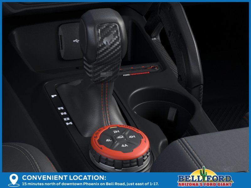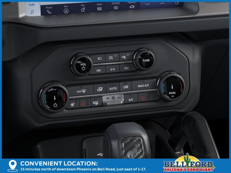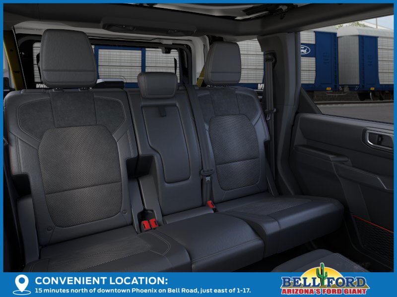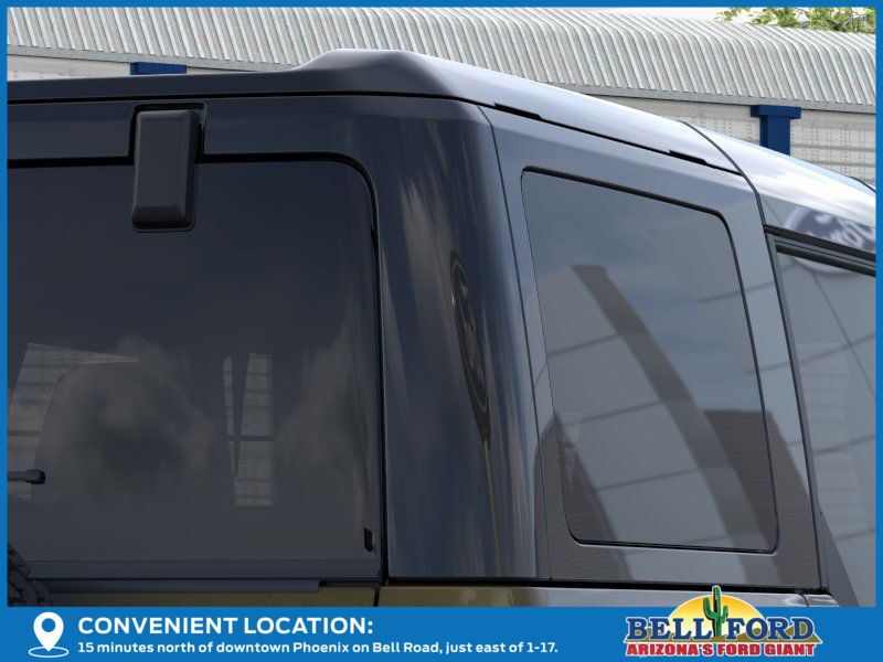 This Ford Bronco is equipped with the following options: Equipment Group 374A Lux Package, Raptor Black Appearance Package (Gloss Black Sideview Mirror Skull Caps, Interior Carbon Fiber Pack, and Wheels: 17" Dark Carbonized Gray Alloy Painted), 12 Speakers, 4-Wheel Disc Brakes, ABS brakes, Air Conditioning, Alloy wheels, AM/FM radio: SiriusXM with 360L, Auto High-beam Headlights, Auto-dimming Rear-View mirror, Automatic temperature control, Brake assist, Compass, Connected Navigation, Convertible HardTop, Convertible roof lining, Delay-off headlights, Driver door bin, Driver vanity mirror, Dual front impact airbags, Dual front side impact airbags, Electronic Stability Control, Emergency communication system: 911 Assist, Exterior Parking Camera Rear, Front anti-roll bar, Front Bucket Seats, Front Center Armrest, Front dual zone A/C, Front fog lights, Front reading lights, Front wheel independent suspension, Fully automatic headlights, Garage door transmitter, Glass rear window, Hard Top Sound Deadening Headliner, Heated door mirrors, Heated front seats, Heated steering wheel, Illuminated entry, Integrated roll-over protection, Leather Shift Knob, Low tire pressure warning, Marine Grade Vinyl Bucket Seats, Navigation system: Connected Navigation, Occupant sensing airbag, Outside temperature display, Overhead airbag, Overhead console, Panic alarm, Passenger door bin, Passenger vanity mirror, Power door mirrors, Power steering, Power windows, Radio data system, Radio: B&O Sound System by Bang & Olufsen, Rear anti-roll bar, Rear seat center armrest, Rear window defroster, Rear window wiper, Rear-Window Defroster & Washer, Remote keyless entry, Security system, Shadow Black Painted Hard Top, SiriusXM w/360L, Speed control, Split folding rear seat, Steering wheel mounted audio controls, SYNC 4, Tachometer, Telescoping steering wheel, Tilt steering wheel, Traction control, Trip computer, Turn signal indicator mirrors, Variably intermittent wipers, Voltmeter, and Wheels: 17" Black High Gloss-Painted Aluminum.