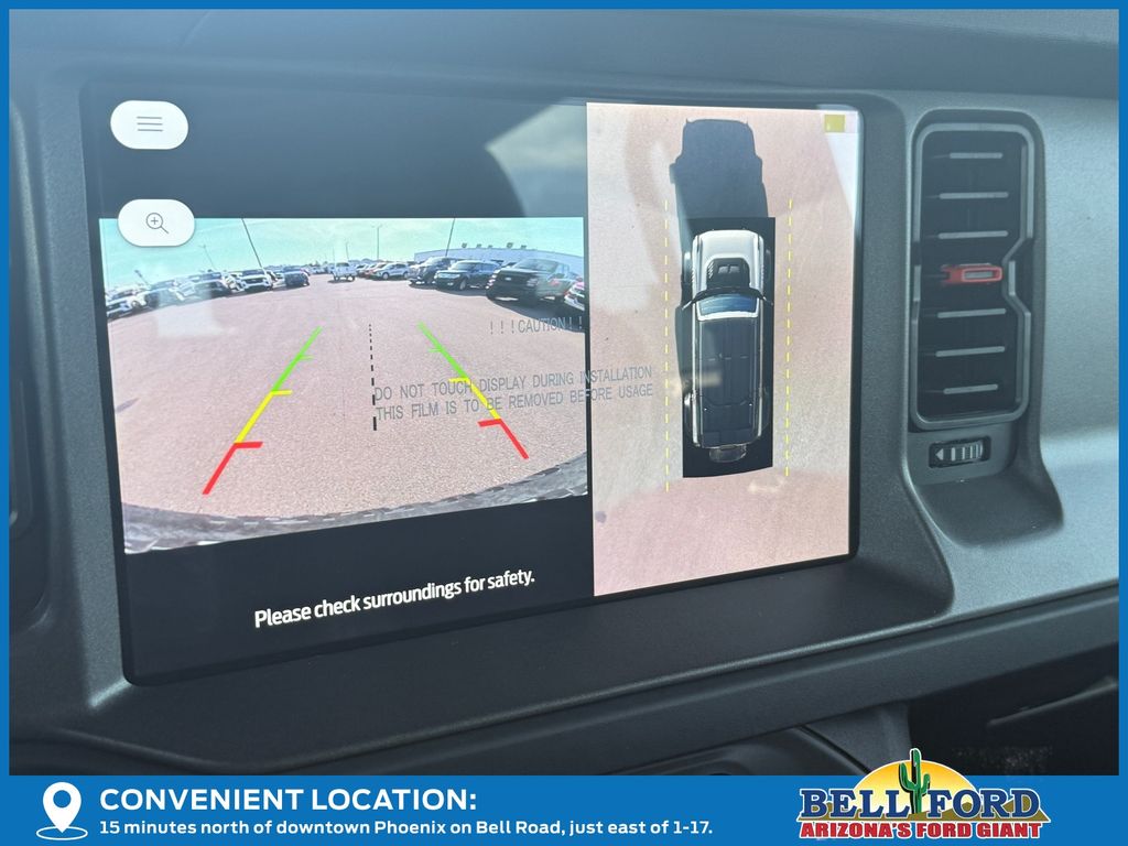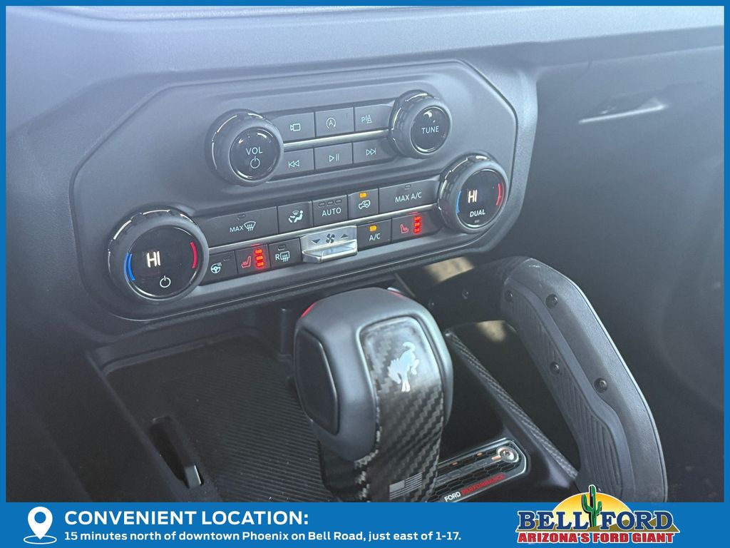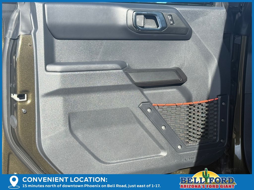 This Ford Bronco is equipped with the following options: Equipment Group 374A Lux Package, Raptor Black Appearance Package (Gloss Black Sideview Mirror Skull Caps, Interior Carbon Fiber Pack, and Wheels: 17" Dark Carbonized Gray Alloy Painted), 12 Speakers, 4-Wheel Disc Brakes, ABS brakes, Air Conditioning, Alloy wheels, AM/FM radio: SiriusXM with 360L, Auto High-beam Headlights, Auto-dimming Rear-View mirror, Automatic temperature control, Brake assist, Compass, Connected Navigation, Convertible HardTop, Convertible roof lining, Delay-off headlights, Driver door bin, Driver vanity mirror, Dual front impact airbags, Dual front side impact airbags, Electronic Stability Control, Emergency communication system: 911 Assist, Exterior Parking Camera Rear, Front anti-roll bar, Front Bucket Seats, Front Center Armrest, Front dual zone A/C, Front fog lights, Front reading lights, Front wheel independent suspension, Fully automatic headlights, Garage door transmitter, Glass rear window, Hard Top Sound Deadening Headliner, Heated door mirrors, Heated front seats, Heated steering wheel, Illuminated entry, Integrated roll-over protection, Internet access capable: FordPass Connect, Leather Shift Knob, Low tire pressure warning, Marine Grade Vinyl Bucket Seats, Navigation system: Connected Navigation, Occupant sensing airbag, Outside temperature display, Overhead airbag, Overhead console, Panic alarm, Passenger door bin, Passenger vanity mirror, Power door mirrors, Power steering, Power windows, Radio data system, Radio: B&O Sound System by Bang & Olufsen, Rear anti-roll bar, Rear seat center armrest, Rear window defroster, Rear window wiper, Rear-Window Defroster & Washer, Remote keyless entry, Security system, Shadow Black Painted Hard Top, SiriusXM w/360L, Speed control, Split folding rear seat, Steering wheel mounted audio controls, SYNC 4, Tachometer, Telescoping steering wheel, Tilt steering wheel, Traction control, Trip computer, Turn signal indicator mirrors, Variably intermittent wipers, Voltmeter, and Wheels: 17" Black High Gloss-Painted Aluminum.