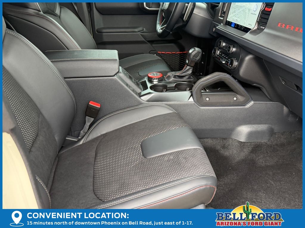 This Ford Bronco is equipped with the following options: Equipment Group 374A Lux Package, 12 Speakers, 4-Wheel Disc Brakes, ABS brakes, Air Conditioning, Alloy wheels, AM/FM radio: SiriusXM with 360L, Auto High-beam Headlights, Auto-dimming Rear-View mirror, Automatic temperature control, Brake assist, Compass, Connected Navigation, Convertible HardTop, Convertible roof lining, Delay-off headlights, Driver door bin, Driver vanity mirror, Dual front impact airbags, Dual front side impact airbags, Electronic Stability Control, Emergency communication system: 911 Assist, Exterior Parking Camera Rear, Front anti-roll bar, Front Bucket Seats, Front Center Armrest, Front dual zone A/C, Front fog lights, Front reading lights, Front wheel independent suspension, Fully automatic headlights, Garage door transmitter, Glass rear window, Hard Top Sound Deadening Headliner, Heated door mirrors, Heated front seats, Heated steering wheel, Illuminated entry, Integrated roll-over protection, Internet access capable: FordPass Connect, Leather Shift Knob, Low tire pressure warning, Marine Grade Vinyl Bucket Seats, Navigation system: Connected Navigation, Occupant sensing airbag, Outside temperature display, Overhead airbag, Overhead console, Panic alarm, Passenger door bin, Passenger vanity mirror, Power door mirrors, Power steering, Power windows, Radio data system, Radio: B&O Sound System by Bang & Olufsen, Rear anti-roll bar, Rear seat center armrest, Rear window defroster, Rear window wiper, Rear-Window Defroster & Washer, Remote keyless entry, Security system, Shadow Black Painted Hard Top, SiriusXM w/360L, Speed control, Split folding rear seat, Steering wheel mounted audio controls, SYNC 4, Tachometer, Telescoping steering wheel, Tilt steering wheel, Traction control, Trip computer, Turn signal indicator mirrors, Variably intermittent wipers, Voltmeter, and Wheels: 17" Black High Gloss-Painted Aluminum.