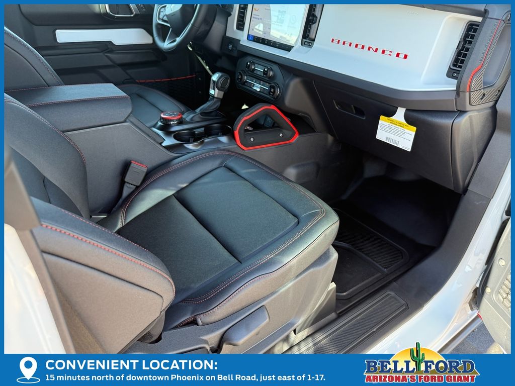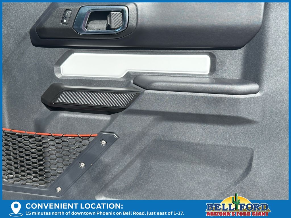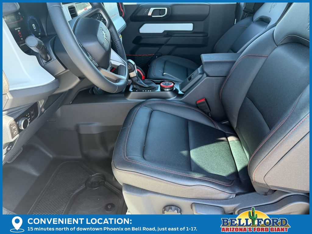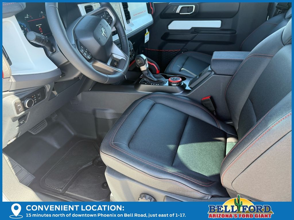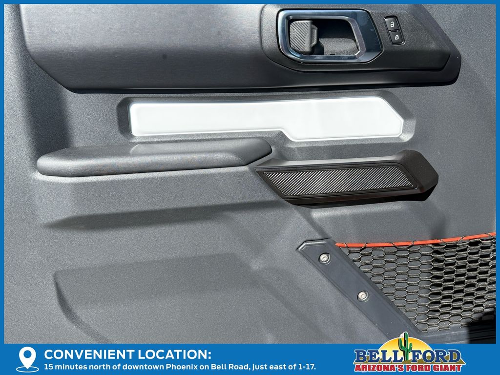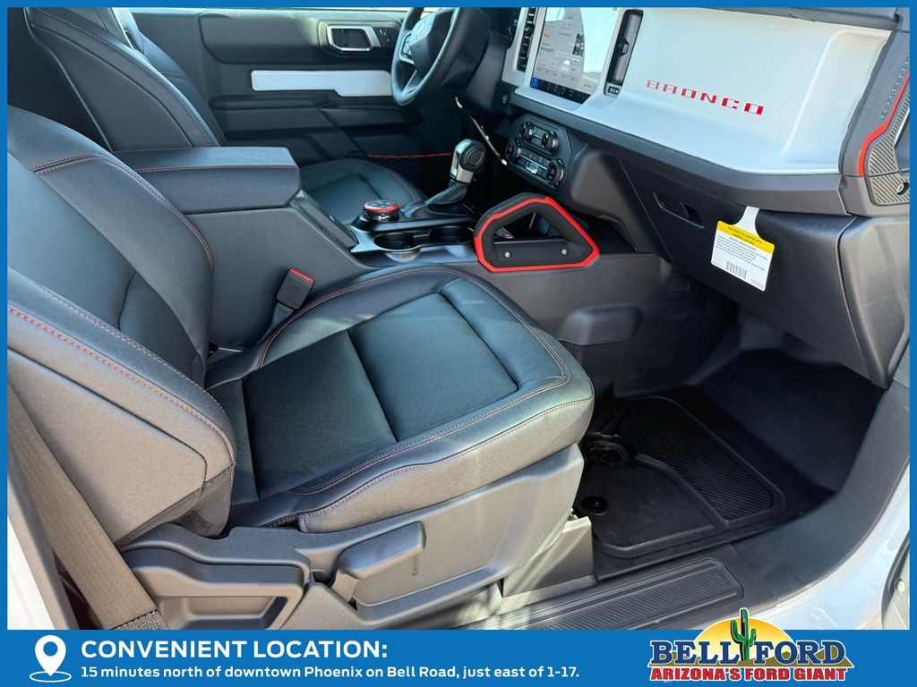 This Ford Bronco is equipped with the following options: ABS brakes, Active Cruise Control, Alloy wheels, Compass, Electronic Stability Control, Front dual zone A/C, Heated door mirrors, Heated front seats, Illuminated entry, Low tire pressure warning, Navigation System, Remote keyless entry, Traction control, 12 Speakers, 4-Wheel Disc Brakes, Air Conditioning, AM/FM radio: SiriusXM with 360L, Auto High-beam Headlights, Auto-dimming Rear-View mirror, Automatic temperature control, Brake assist, Connected Navigation, Convertible HardTop, Convertible roof lining, Delay-off headlights, Driver door bin, Driver vanity mirror, Dual front impact airbags, Dual front side impact airbags, Emergency communication system: 911 Assist, Exterior Parking Camera Rear, Front anti-roll bar, Front Bucket Seats, Front Center Armrest, Front reading lights, Front wheel independent suspension, Fully automatic headlights, Garage door transmitter, Glass rear window, Heated steering wheel, Integrated roll-over protection, Leather Shift Knob, Navigation system: Connected Navigation, Occupant sensing airbag, Outside temperature display, Overhead airbag, Overhead console, Panic alarm, Passenger door bin, Passenger vanity mirror, Power door mirrors, Power steering, Power windows, Radio data system, Radio: B&O Sound System by Bang & Olufsen, Rear anti-roll bar, Rear window defroster, Rear window wiper, Security system, SiriusXM w/360L, Speed control, Split folding rear seat, Steering wheel mounted audio controls, SYNC 4, Tachometer, Telescoping steering wheel, Tilt steering wheel, Trip computer, Turn signal indicator mirrors, Unique Vinyl Bucket Seats, Variably intermittent wipers, Voltmeter, and Wheels: 17" Unique Matte Black-Painted Alloy.