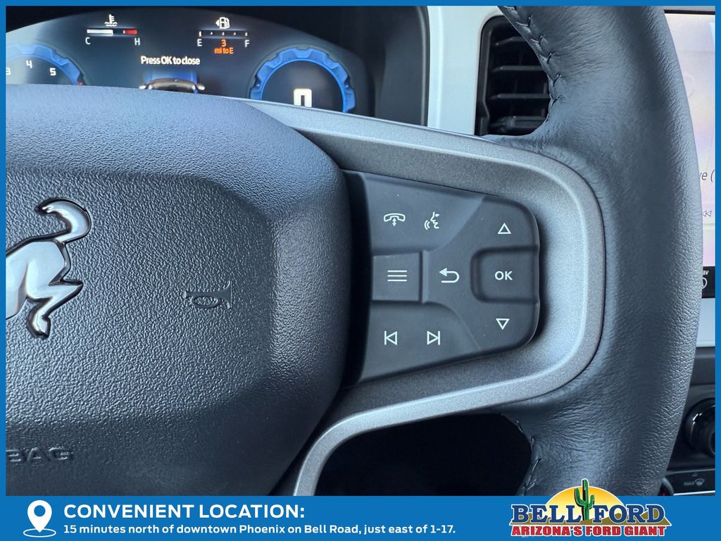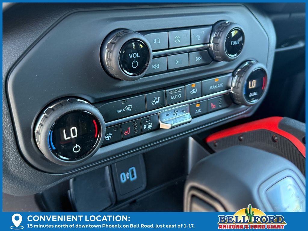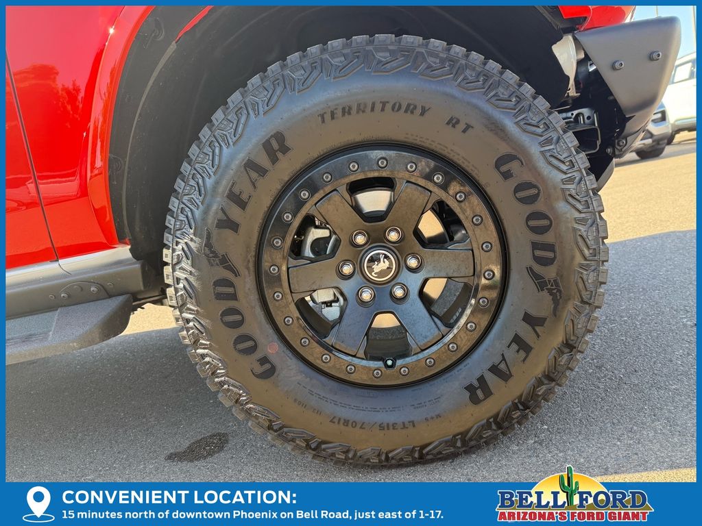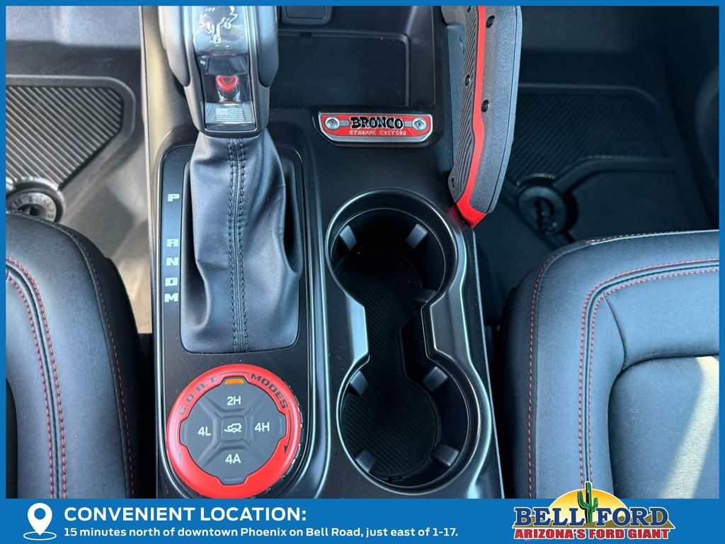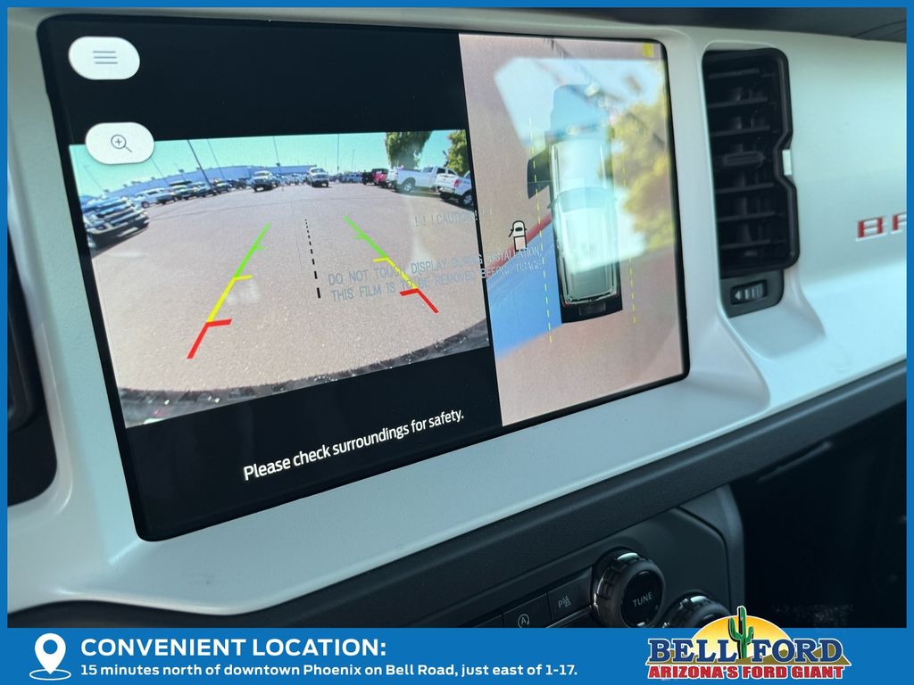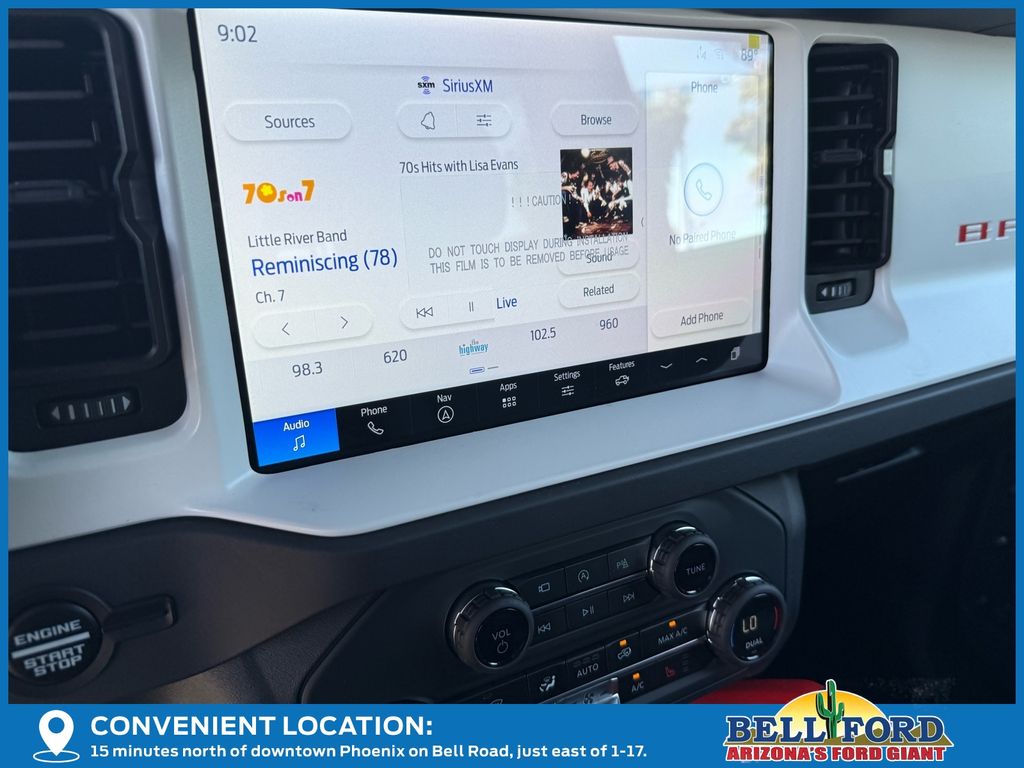 This Ford Bronco is equipped with the following options: ABS brakes, Active Cruise Control, Alloy wheels, Compass, Electronic Stability Control, Front dual zone A/C, Heated door mirrors, Heated front seats, Illuminated entry, Low tire pressure warning, Navigation System, Remote keyless entry, Traction control, 12 Speakers, 4-Wheel Disc Brakes, Air Conditioning, AM/FM radio: SiriusXM with 360L, Auto High-beam Headlights, Auto-dimming Rear-View mirror, Automatic temperature control, Brake assist, Connected Navigation, Convertible HardTop, Convertible roof lining, Delay-off headlights, Driver door bin, Driver vanity mirror, Dual front impact airbags, Dual front side impact airbags, Emergency communication system: 911 Assist, Exterior Parking Camera Rear, Front anti-roll bar, Front Bucket Seats, Front Center Armrest, Front reading lights, Front wheel independent suspension, Fully automatic headlights, Garage door transmitter, Glass rear window, Heated steering wheel, Integrated roll-over protection, Leather Shift Knob, Navigation system: Connected Navigation, Occupant sensing airbag, Outside temperature display, Overhead airbag, Overhead console, Panic alarm, Passenger door bin, Passenger vanity mirror, Power door mirrors, Power steering, Power windows, Radio data system, Radio: B&O Sound System by Bang & Olufsen, Rear anti-roll bar, Rear window defroster, Rear window wiper, Security system, SiriusXM w/360L, Speed control, Split folding rear seat, Steering wheel mounted audio controls, SYNC 4, Tachometer, Telescoping steering wheel, Tilt steering wheel, Trip computer, Turn signal indicator mirrors, Unique Vinyl Bucket Seats, Variably intermittent wipers, Voltmeter, and Wheels: 17" Unique Matte Black-Painted Alloy.