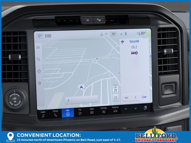 This Ford F-150 is equipped with the following options: Equipment Group 501A Mid (6" Angular Bright Anodized Step Bar, Illuminated Driver & Passenger Visors, Power-Sliding Rear Window, and Wheels: 20" Chrome-Like PVD), FX4 Off-Road Package (4x4 FX4 Off-Road Bodyside Decal, Hill Descent Control, Monotube Rear Shocks, Off-Road Tuned Front Shock Absorbers, Rock Crawl Mode, and Tray Style Floor Liner w/o Carpet Mats), Tow/Haul Package, 4WD, 4-Wheel Disc Brakes, 8 Speakers, ABS brakes, ActiveX Trimmed Bucket Seats, Adjustable pedals, Air Conditioning, Alloy wheels, AM/FM radio: SiriusXM with 360L, Auto High-beam Headlights, Auto-dimming door mirrors, Auto-dimming Rear-View mirror, Automatic temperature control, Brake assist, Bumpers: chrome, Chrome wheels, Compass, Delay-off headlights, Driver door bin, Driver vanity mirror, Dual front impact airbags, Dual front side impact airbags, Electronic Stability Control, Emergency communication system: SYNC 4 911 Assist, First Aid Kit w/Ford Logo, Front anti-roll bar, Front Bucket Seats, Front Center Armrest, Front dual zone A/C, Front fog lights, Front reading lights, Front wheel independent suspension, Fully automatic headlights, Garage door transmitter, Heated door mirrors, Heated front seats, Heated steering wheel, Illuminated entry, Low tire pressure warning, Memory seat, Navigation system: Connected Navigation, Occupant sensing airbag, Outside temperature display, Overhead airbag, Overhead console, Panic alarm, Passenger door bin, Passenger vanity mirror, Pedal memory, Power door mirrors, Power driver seat, Power passenger seat, Power steering, Power windows, Radio data system, Radio: B&O Sound System by Bang & Olufsen, Rain sensing wipers, Rear reading lights, Rear seat center armrest, Rear step bumper, Rear window defroster, Remote keyless entry, Security system, Speed control, Split folding rear seat, Steering wheel mounted audio controls, SYNC 4 w/Enhanced Voice Recognition, Tachometer, Telescoping steering wheel, Tilt steering wheel, Traction control, Trip computer, Turn signal indicator mirrors, Variably intermittent wipers, Ventilated front seats, Voltmeter, and Wheels: 18" Chrome-Like PVD.