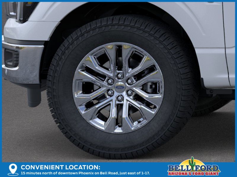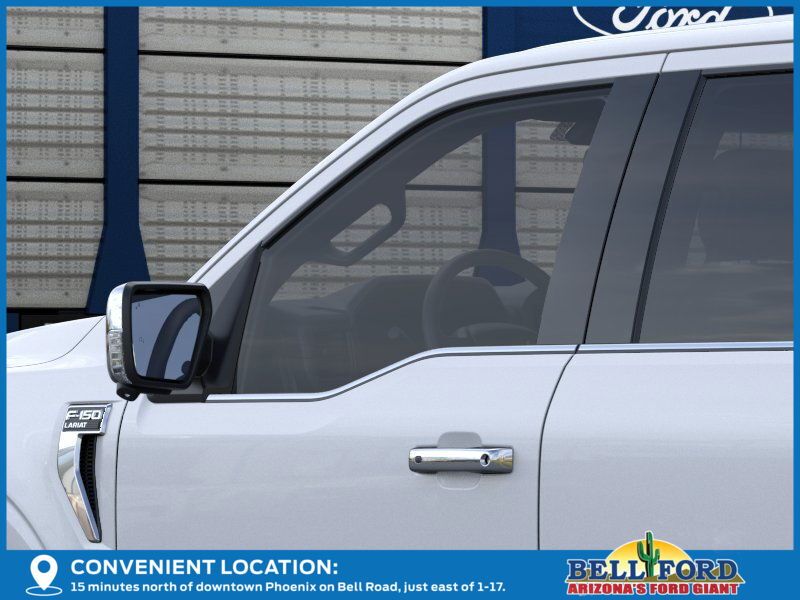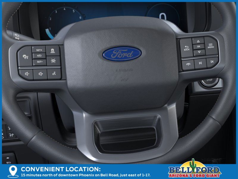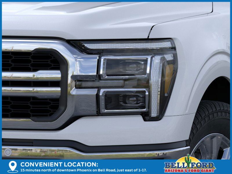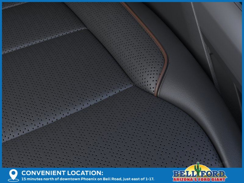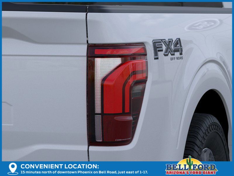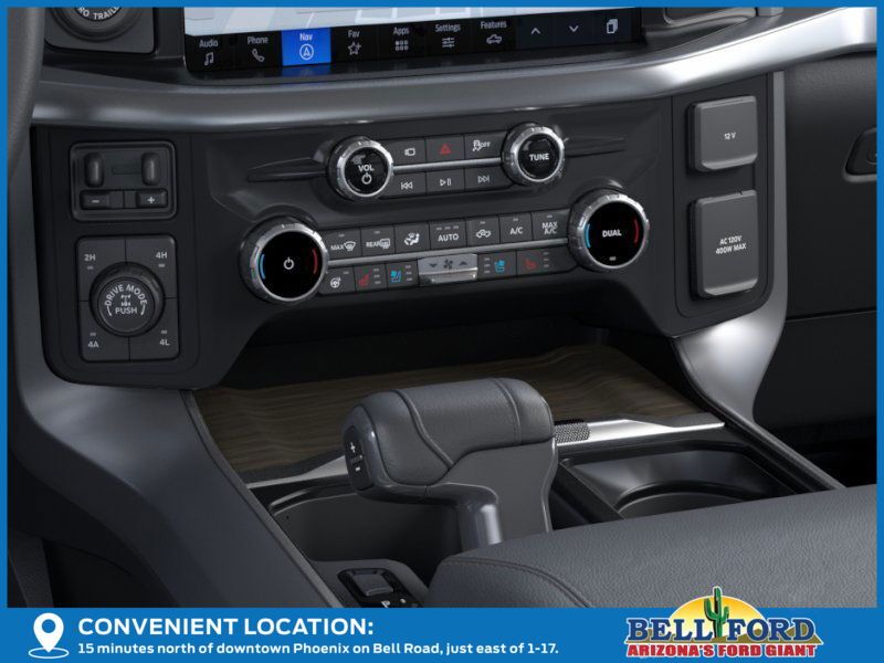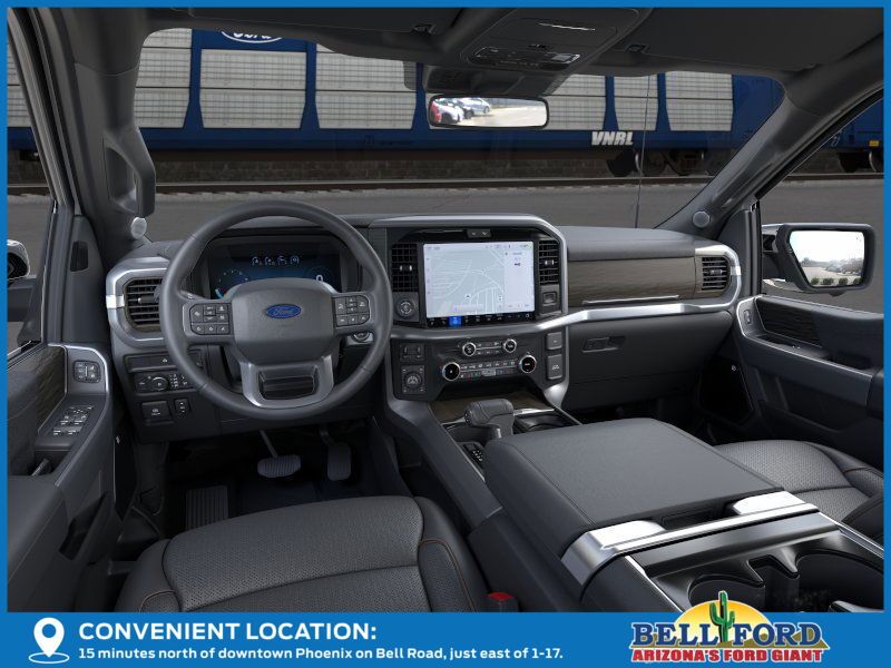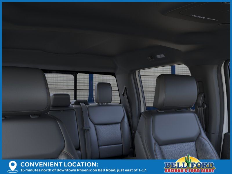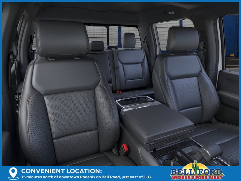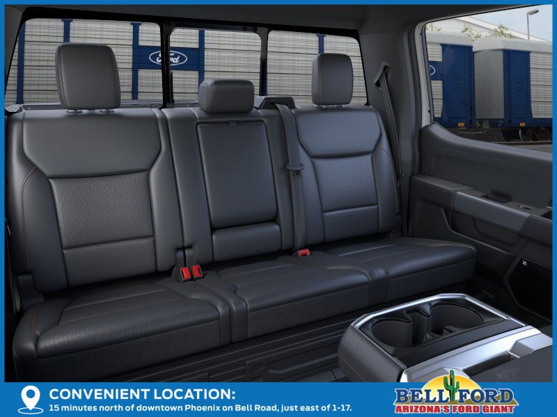 This Ford F-150 is equipped with the following options: Equipment Group 502A High (2nd Row Heated Seats, Ambient Lighting - Ice Blue Color Only, Heads-Up Display, Illuminated Driver & Passenger Visors, Power-Sliding Rear Window, Radio: B&O Unleashed Sound System by Bang & Olufsen, and Wheels: 20" Chrome-Like PVD), FX4 Off-Road Package (4x4 FX4 Off-Road Bodyside Decal, Hill Descent Control, Monotube Rear Shocks, Off-Road Tuned Front Shock Absorbers, Rock Crawl Mode, and Tray Style Floor Liner w/o Carpet Mats), Mobile Office Package (Console Worksurface, Partitioned Lockable Rear Storage, and Wireless Charging), Tow/Haul Package, 4WD, 4-Wheel Disc Brakes, 8 Speakers, ABS brakes, ActiveX Trimmed Bucket Seats, Adjustable pedals, Air Conditioning, Alloy wheels, AM/FM radio: SiriusXM with 360L, Auto High-beam Headlights, Auto-dimming door mirrors, Auto-dimming Rear-View mirror, Automatic temperature control, Brake assist, Bumpers: chrome, Chrome wheels, Compass, Delay-off headlights, Driver door bin, Driver vanity mirror, Dual front impact airbags, Dual front side impact airbags, Electronic Stability Control, Emergency communication system: SYNC 4 911 Assist, Front anti-roll bar, Front Bucket Seats, Front Center Armrest, Front dual zone A/C, Front fog lights, Front reading lights, Front wheel independent suspension, Fully automatic headlights, Garage door transmitter, Heated door mirrors, Heated front seats, Heated steering wheel, Illuminated entry, Low tire pressure warning, Memory seat, Navigation system: Connected Navigation, Occupant sensing airbag, Outside temperature display, Overhead airbag, Overhead console, Panic alarm, Passenger door bin, Passenger vanity mirror, Pedal memory, Power door mirrors, Power driver seat, Power passenger seat, Power steering, Power windows, Radio data system, Radio: B&O Sound System by Bang & Olufsen, Rain sensing wipers, Rear reading lights, Rear seat center armrest, Rear step bumper, Rear window defroster, Remote keyless entry, Security system, Speed control, Split folding rear seat, Steering wheel mounted audio controls, SYNC 4 w/Enhanced Voice Recognition, Tachometer, Telescoping steering wheel, Tilt steering wheel, Traction control, Trip computer, Turn signal indicator mirrors, Variably intermittent wipers, Ventilated front seats, Voltmeter, and Wheels: 18" Chrome-Like PVD.