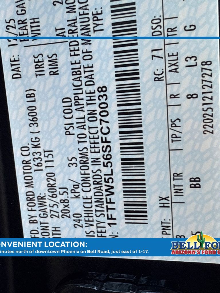 This Ford F-150 is equipped with the following options: Equipment Group 502A High (2nd Row Heated Seats, Ambient Lighting - Ice Blue Color Only, Heads-Up Display, Illuminated Driver & Passenger Visors, Power-Sliding Rear Window, Radio: B&O Unleashed Sound System by Bang & Olufsen, and Wheels: 20" Chrome-Like PVD), FX4 Off-Road Package (4x4 FX4 Off-Road Bodyside Decal, Hill Descent Control, Monotube Rear Shocks, Off-Road Tuned Front Shock Absorbers, Rock Crawl Mode, and Tray Style Floor Liner w/o Carpet Mats), Mobile Office Package (Console Worksurface, Partitioned Lockable Rear Storage, and Wireless Charging), 4WD, 4-Wheel Disc Brakes, 8 Speakers, ABS brakes, ActiveX Trimmed Bucket Seats, Adjustable pedals, Air Conditioning, Alloy wheels, AM/FM radio: SiriusXM with 360L, Auto High-beam Headlights, Auto-dimming door mirrors, Auto-dimming Rear-View mirror, Automatic temperature control, Brake assist, Bumpers: chrome, Chrome wheels, Compass, Delay-off headlights, Driver door bin, Driver vanity mirror, Dual front impact airbags, Dual front side impact airbags, Electronic Stability Control, Emergency communication system: SYNC 4 911 Assist, First Aid Kit w/Ford Logo, Front anti-roll bar, Front Bucket Seats, Front Center Armrest, Front dual zone A/C, Front fog lights, Front reading lights, Front wheel independent suspension, Fully automatic headlights, Garage door transmitter, Heated door mirrors, Heated front seats, Heated steering wheel, Illuminated entry, Internet access capable: FordPass Connect 5G, Low tire pressure warning, Memory seat, Navigation system: Connected Navigation, Occupant sensing airbag, Outside temperature display, Overhead airbag, Overhead console, Panic alarm, Passenger door bin, Passenger vanity mirror, Pedal memory, Power door mirrors, Power driver seat, Power passenger seat, Power steering, Power windows, Radio data system, Radio: B&O Sound System by Bang & Olufsen, Rain sensing wipers, Rear reading lights, Rear seat center armrest, Rear step bumper, Rear window defroster, Remote keyless entry, Security system, Speed control, Split folding rear seat, Steering wheel mounted audio controls, SYNC 4 w/Enhanced Voice Recognition, Tachometer, Telescoping steering wheel, Tilt steering wheel, Traction control, Trip computer, Turn signal indicator mirrors, Variably intermittent wipers, Ventilated front seats, Voltmeter, and Wheels: 18" Chrome-Like PVD. Price includes: $2000 - Retail Customer Cash. Exp. 03/31/2026 $500 - Retail Bonus Cash. Exp. 03/31/2026