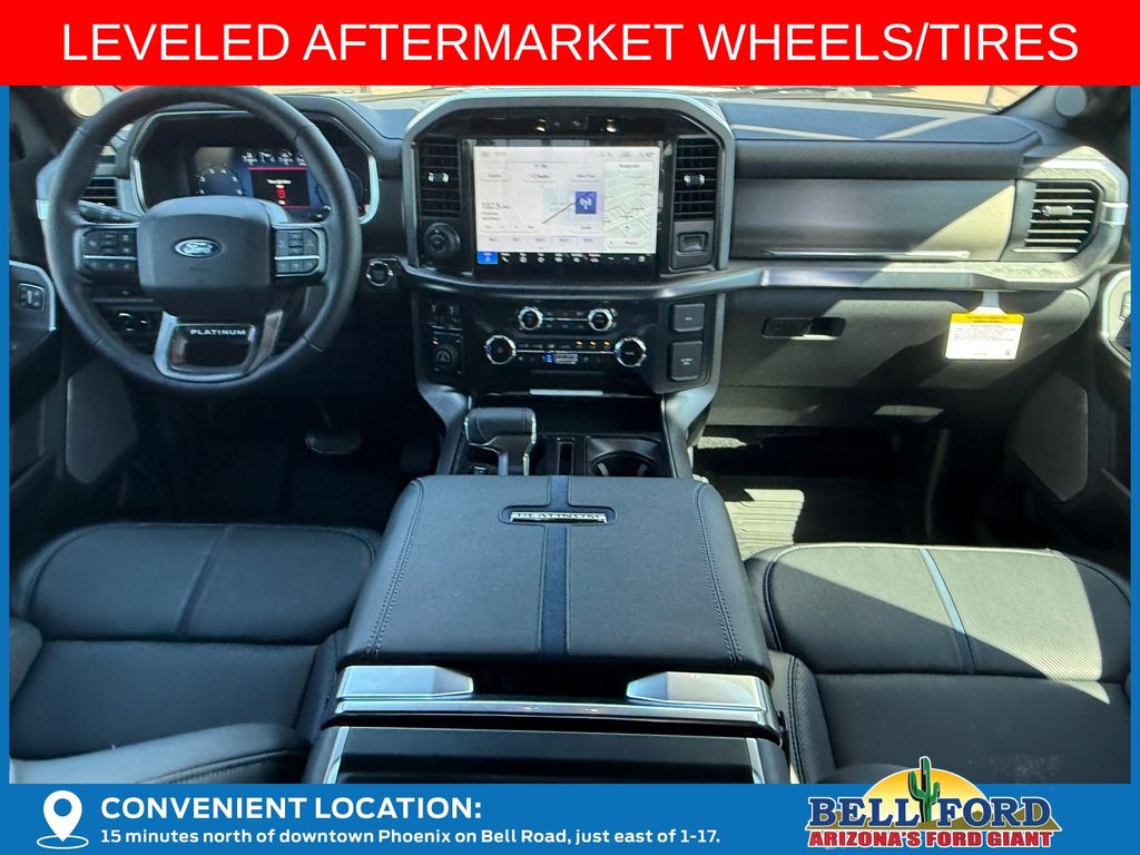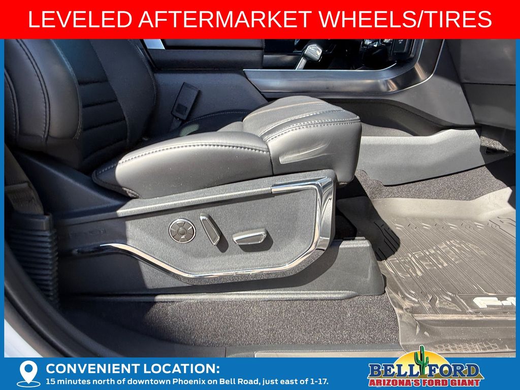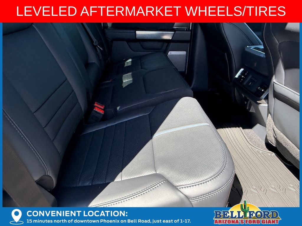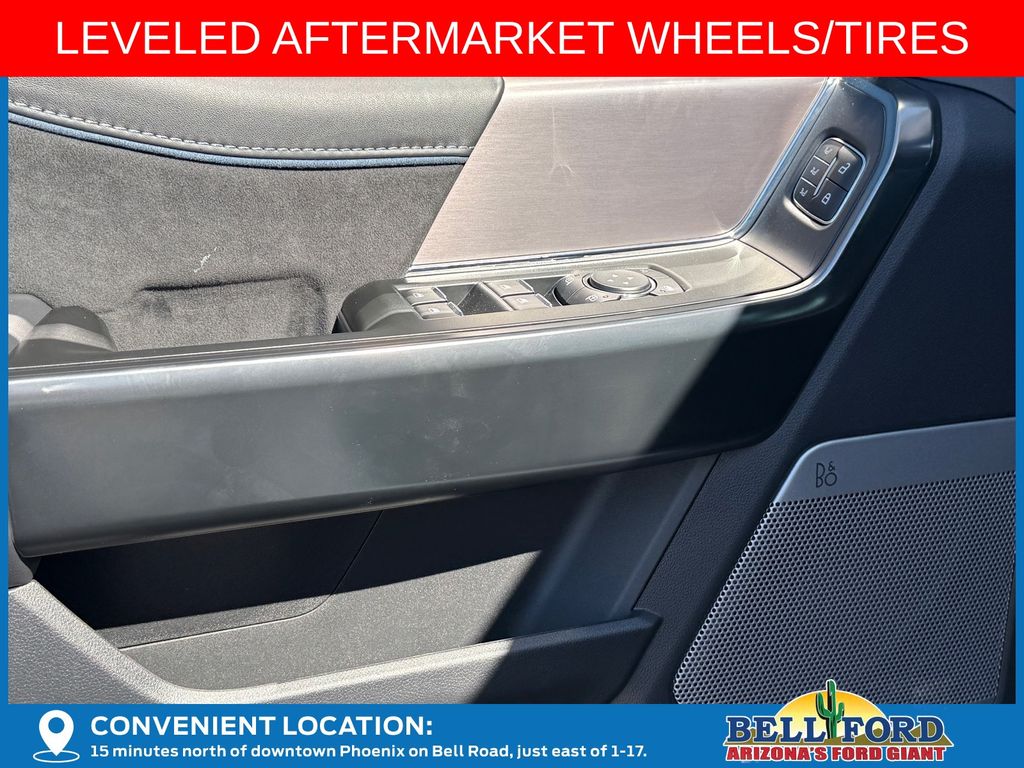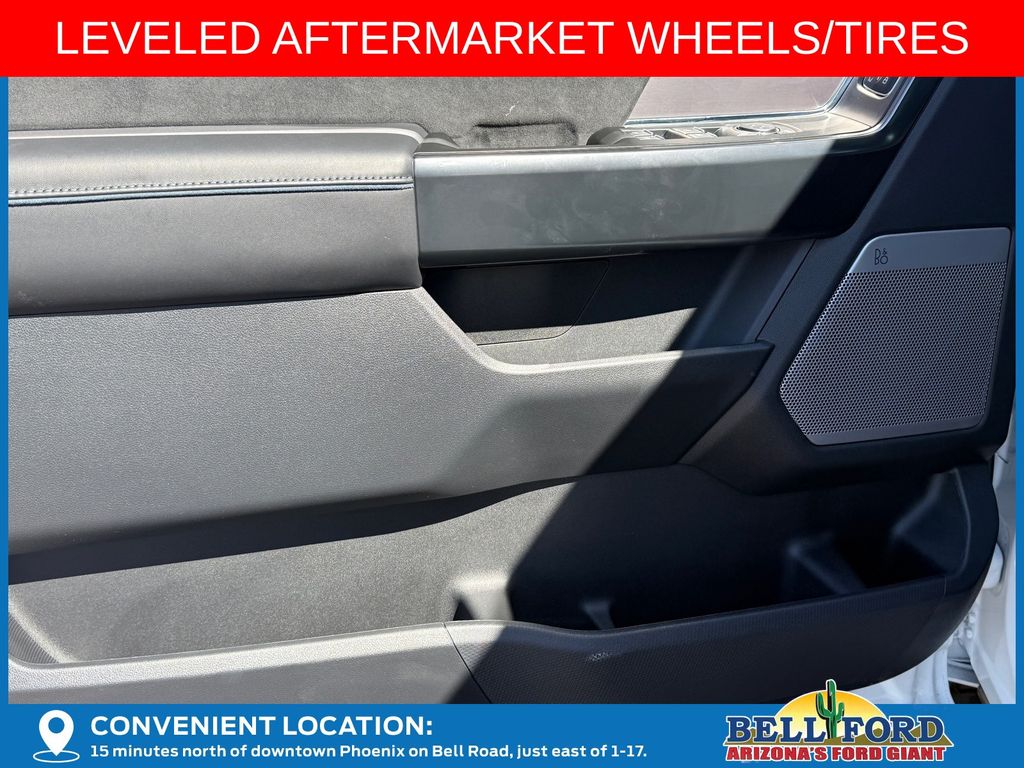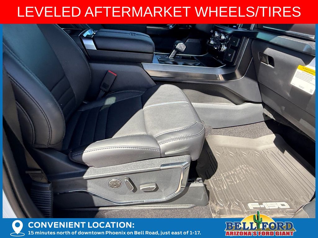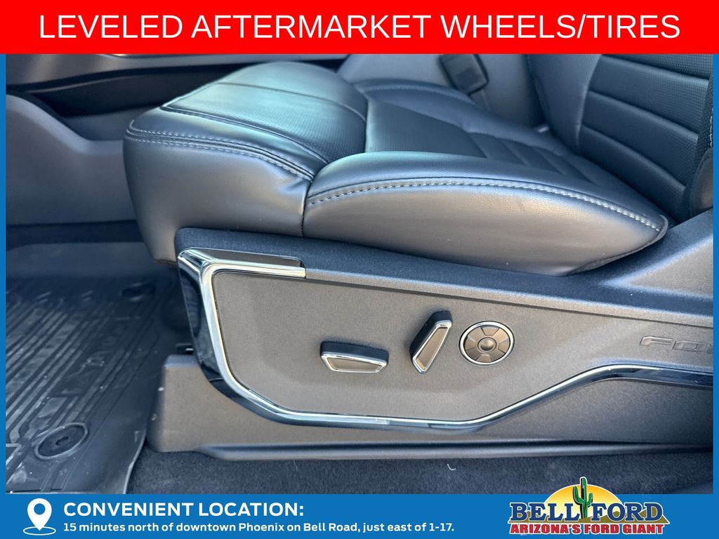 This Ford F-150 is equipped with the following options: Equipment Group 701A Standard, FX4 Off-Road Package (4x4 FX4 Off-Road Bodyside Decal, Hill Descent Control, Monotube Rear Shocks, Off-Road Tuned Front Shock Absorbers, and Rock Crawl Mode), 4WD, 4-Wheel Disc Brakes, 8 Speakers, ABS brakes, Adjustable pedals, Air Conditioning, Alloy wheels, AM/FM radio: SiriusXM with 360L, Auto High-beam Headlights, Auto tilt-away steering wheel, Auto-dimming door mirrors, Auto-dimming Rear-View mirror, Automatic temperature control, Brake assist, Bumpers: body-color, Compass, Delay-off headlights, Driver door bin, Driver vanity mirror, Dual front impact airbags, Dual front side impact airbags, Electronic Locking w/3.55 Axle Ratio, Electronic Stability Control, Emergency communication system: SYNC 4 911 Assist, Front anti-roll bar, Front Bucket Seats, Front Center Armrest, Front dual zone A/C, Front fog lights, Front reading lights, Front wheel independent suspension, Fully automatic headlights, Garage door transmitter, Heated door mirrors, Heated front seats, Heated rear seats, Heated steering wheel, Illuminated entry, Internet access capable: FordPass Connect 5G, Leather steering wheel, Low tire pressure warning, Memory seat, Navigation system: Connected Navigation, Occupant sensing airbag, Outside temperature display, Overhead airbag, Overhead console, Panic alarm, Passenger door bin, Passenger vanity mirror, Pedal memory, Power door mirrors, Power driver seat, Power passenger seat, Power steering, Power windows, Radio data system, Radio: B&O Sound System by Bang & Olufsen, Rain sensing wipers, Rear reading lights, Rear seat center armrest, Rear step bumper, Rear window defroster, Remote keyless entry, Security system, Speed control, Split folding rear seat, Steering wheel memory, Steering wheel mounted audio controls, SYNC 4 w/Enhanced Voice Recognition, Tachometer, Telescoping steering wheel, Tilt steering wheel, Tough Bed Spray-In Bedliner, Traction control, Tray Style Floor Liner, Trip computer, Turn signal indicator mirrors, Unique Multi-Contour Leather Bucket Seats, Variably intermittent wipers, Ventilated front seats, Voltmeter, Wheel Well Liner, and Wheels: 20" Painted Gloss Ebony Black. Price includes dealer added accessories totaling $8,690.