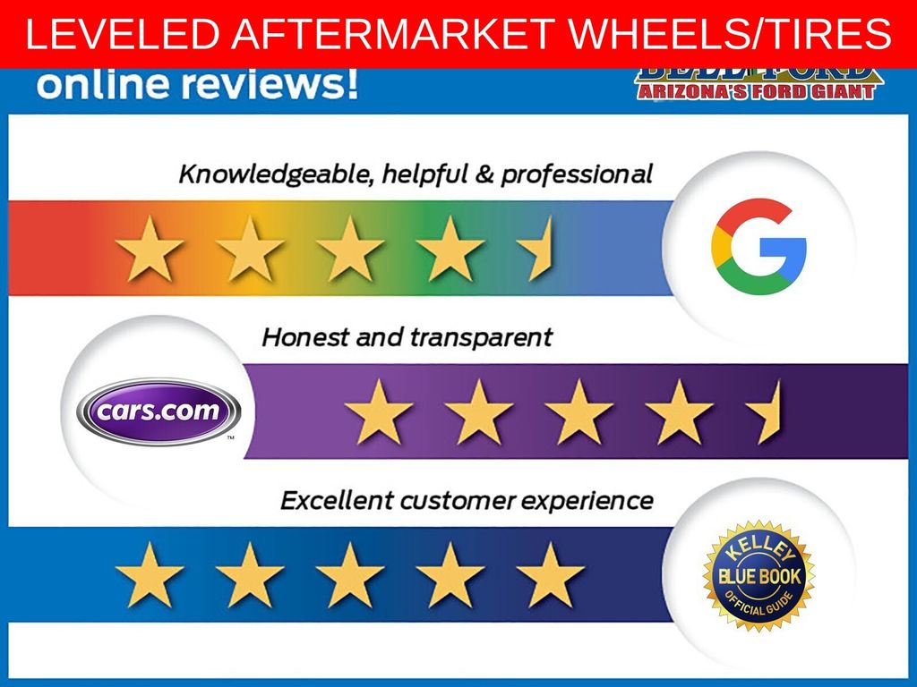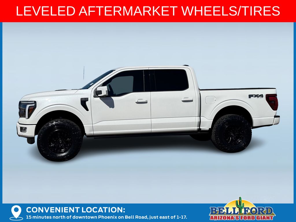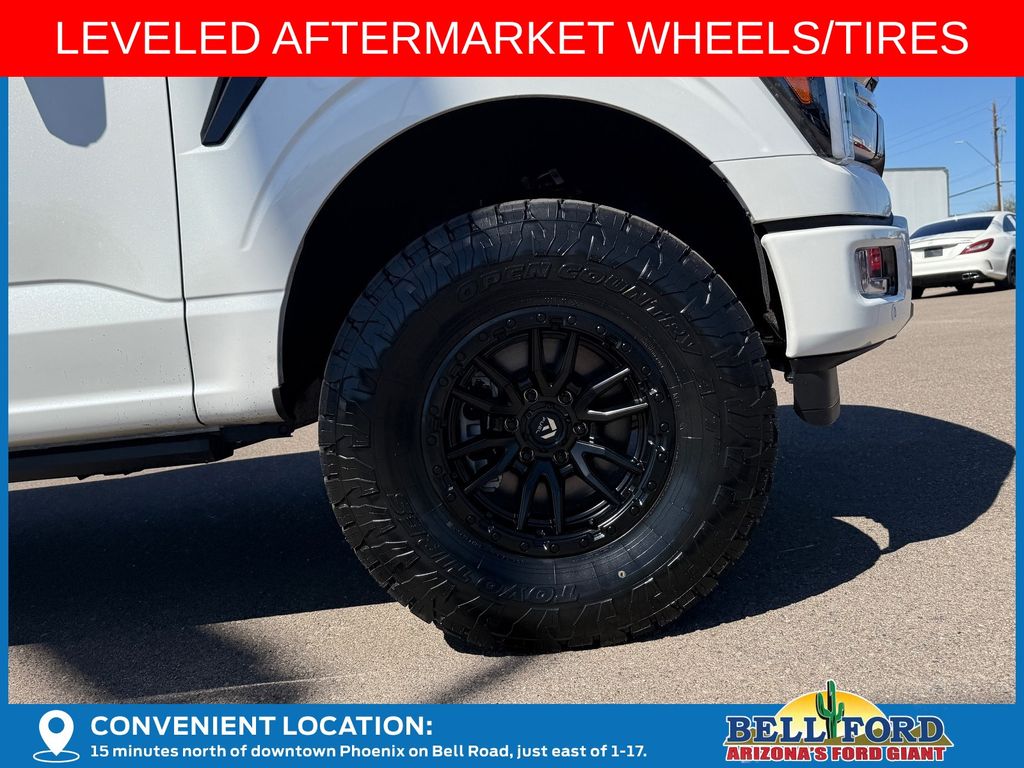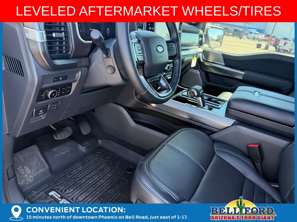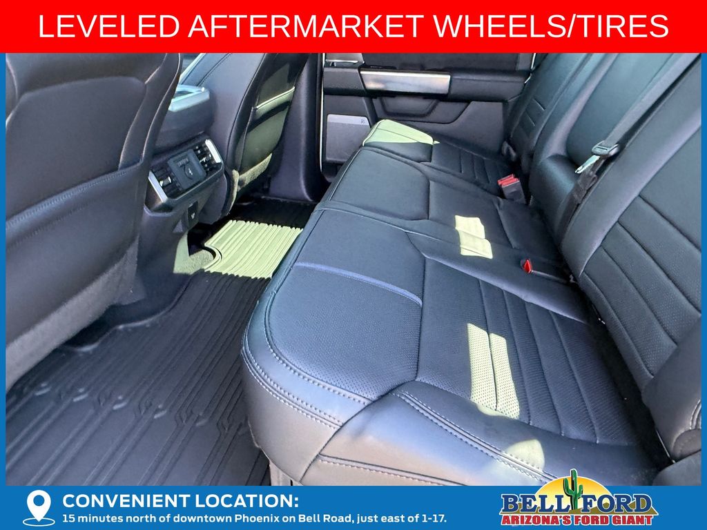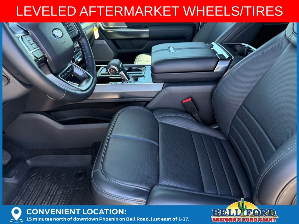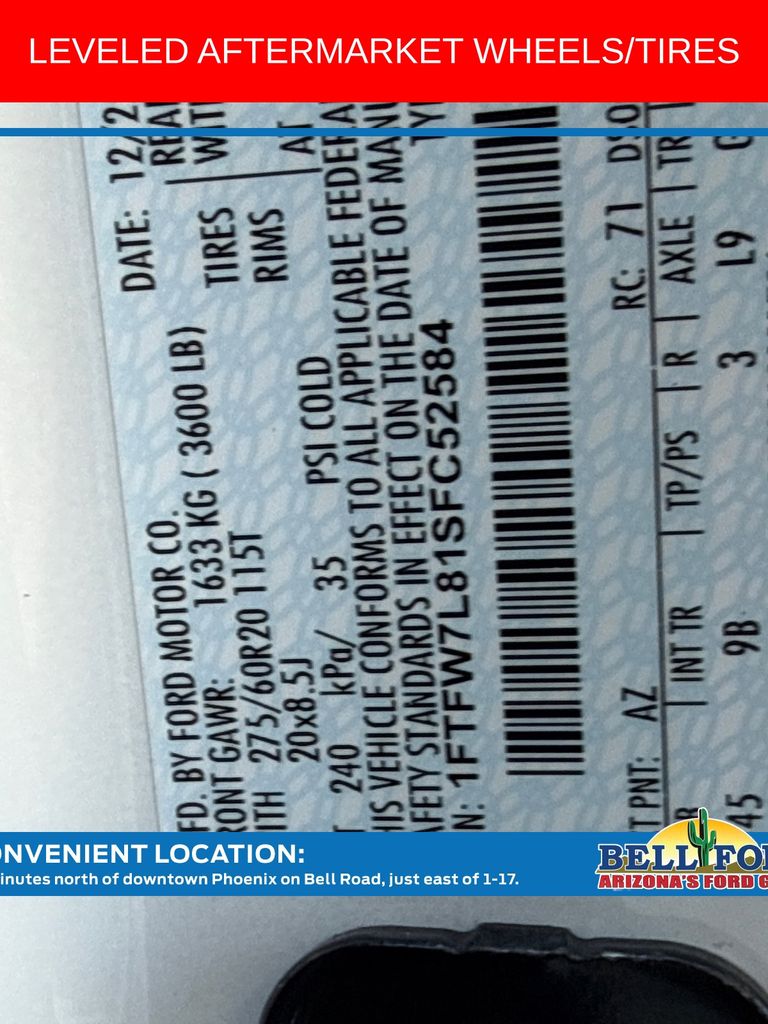This Ford F-150 is equipped with the following options: Equipment Group 701A Standard, FX4 Off-Road Package (4x4 FX4 Off-Road Bodyside Decal, Hill Descent Control, Monotube Rear Shocks, Off-Road Tuned Front Shock Absorbers, and Rock Crawl Mode), 4WD, 4-Wheel Disc Brakes, 8 Speakers, ABS brakes, Adjustable pedals, Air Conditioning, Alloy wheels, AM/FM radio: SiriusXM with 360L, Auto High-beam Headlights, Auto tilt-away steering wheel, Auto-dimming door mirrors, Auto-dimming Rear-View mirror, Automatic temperature control, Brake assist, Bumpers: body-color, Compass, Delay-off headlights, Driver door bin, Driver vanity mirror, Dual front impact airbags, Dual front side impact airbags, Electronic Locking w/3.55 Axle Ratio, Electronic Stability Control, Emergency communication system: SYNC 4 911 Assist, Front anti-roll bar, Front Bucket Seats, Front Center Armrest, Front dual zone A/C, Front fog lights, Front reading lights, Front wheel independent suspension, Fully automatic headlights, Garage door transmitter, Heated door mirrors, Heated front seats, Heated rear seats, Heated steering wheel, Illuminated entry, Internet access capable: FordPass Connect 5G, Leather steering wheel, Low tire pressure warning, Memory seat, Navigation system: Connected Navigation, Occupant sensing airbag, Outside temperature display, Overhead airbag, Overhead console, Panic alarm, Passenger door bin, Passenger vanity mirror, Pedal memory, Power door mirrors, Power driver seat, Power passenger seat, Power steering, Power windows, Radio data system, Radio: B&O Sound System by Bang & Olufsen, Rain sensing wipers, Rear reading lights, Rear seat center armrest, Rear step bumper, Rear window defroster, Remote keyless entry, Security system, Speed control, Split folding rear seat, Steering wheel memory, Steering wheel mounted audio controls, SYNC 4 w/Enhanced Voice Recognition, Tachometer, Telescoping steering wheel, Tilt steering wheel, Tough Bed Spray-In Bedliner, Traction control, Tray Style Floor Liner, Trip computer, Turn signal indicator mirrors, Unique Multi-Contour Leather Bucket Seats, Variably intermittent wipers, Ventilated front seats, Voltmeter, Wheel Well Liner, and Wheels: 20" Painted Gloss Ebony Black. Price includes dealer added accessories totaling $8,690.