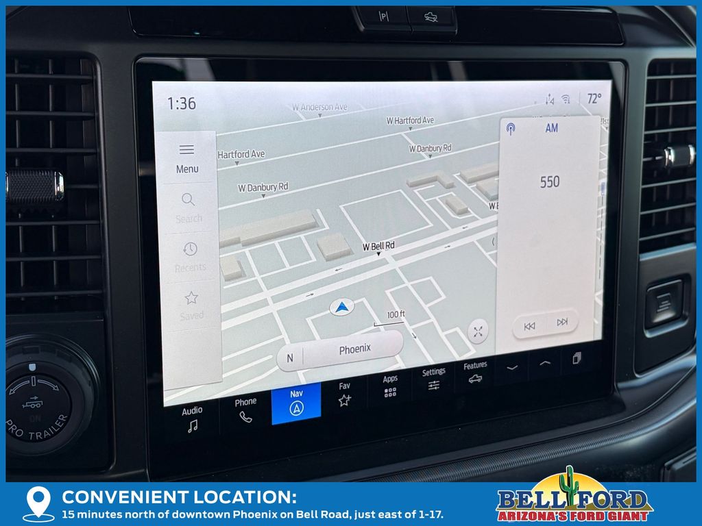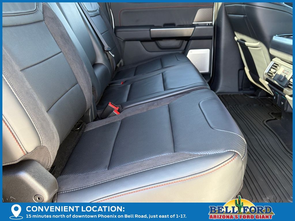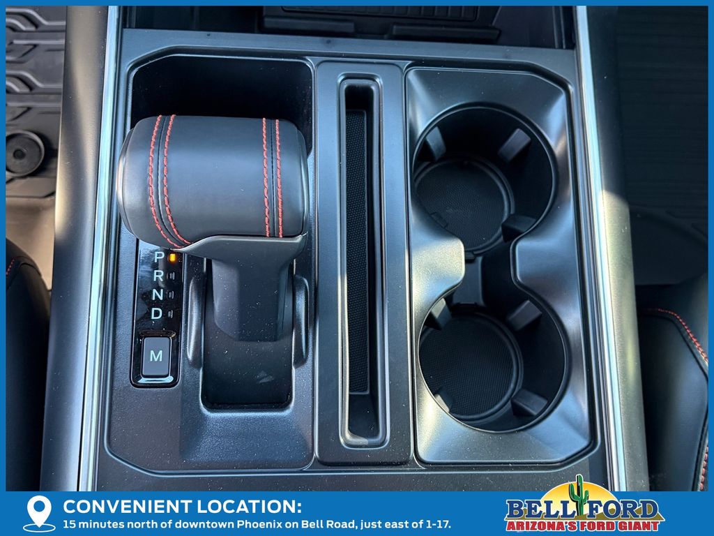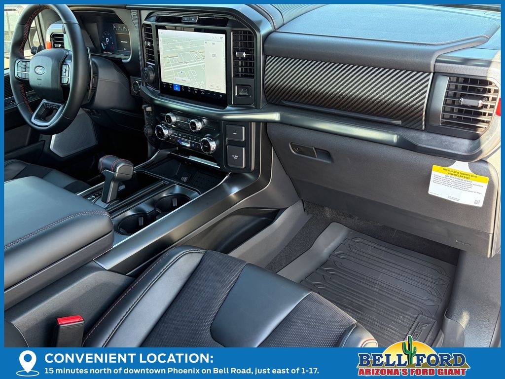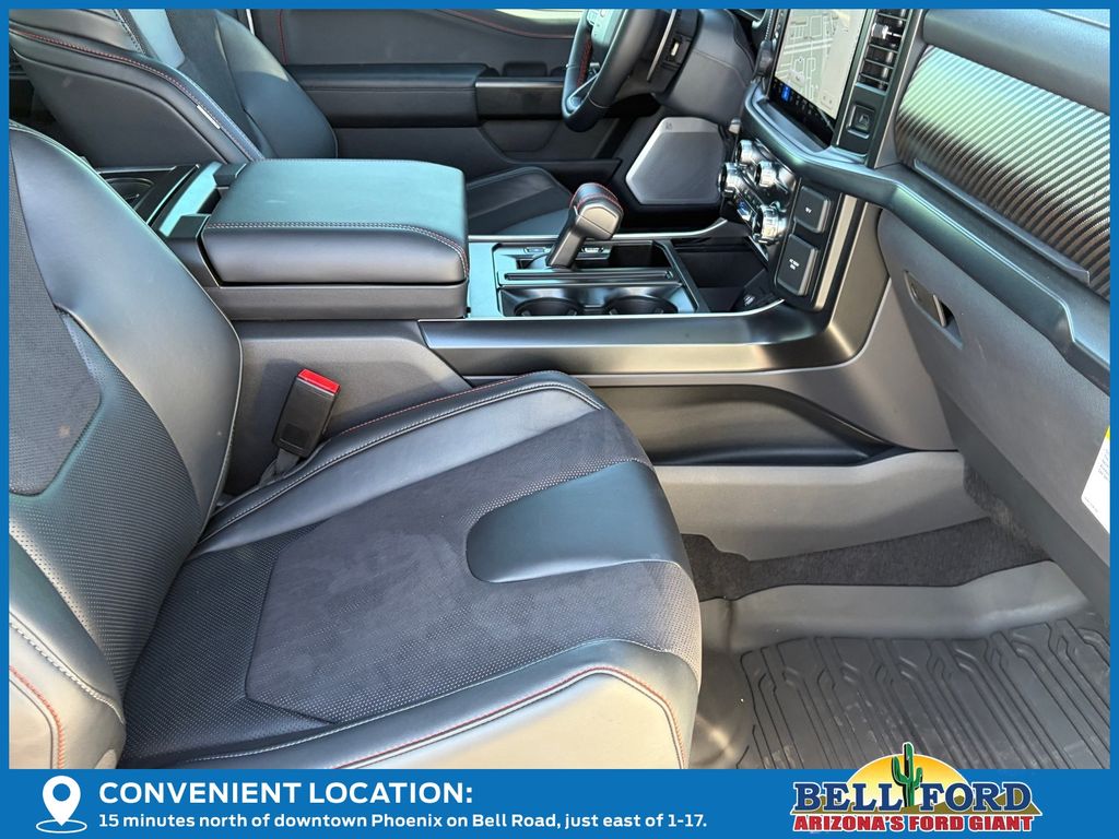 This Ford F-150 is equipped with the following options: Equipment Group 802A Raptor 37 (Carbon Fiber Interior Appliques, Dual Valve Shocks, Modular Front Bumper, RECARO Alcantara Suede Front Seats, and Wheels: Raptor 37 Unique 17" Cast Aluminum), 4WD, 14 Speakers, 17" Cast Aluminum Wheels, 4-Wheel Disc Brakes, ABS brakes, Adjustable pedals, Air Conditioning, Alloy wheels, AM/FM radio: SiriusXM with 360L, Auto High-beam Headlights, Auto tilt-away steering wheel, Auto-dimming door mirrors, Auto-dimming Rear-View mirror, Automatic temperature control, Brake assist, Bumpers: body-color, Compass, Delay-off headlights, Driver door bin, Driver vanity mirror, Dual front impact airbags, Dual front side impact airbags, Electronic Locking w/4.10 Axle Ratio, Electronic Stability Control, Emergency communication system: SYNC 4 911 Assist, Front anti-roll bar, Front Bucket Seats, Front Center Armrest, Front dual zone A/C, Front fog lights, Front reading lights, Front wheel independent suspension, Fully automatic headlights, Garage door transmitter, Heads-Up Display, Heated door mirrors, Heated front seats, Heated rear seats, Heated steering wheel, Illuminated entry, Lane Departure Warning System, Leather steering wheel, Leather Trimmed Seats, Low tire pressure warning, Memory seat, Navigation system: Connected Navigation, Occupant sensing airbag, Outside temperature display, Overhead airbag, Overhead console, Panic alarm, Passenger door bin, Passenger vanity mirror, Pedal memory, Power door mirrors, Power driver seat, Power passenger seat, Power steering, Power windows, Radio data system, Radio: B&O Unleashed Sound System by Bang & Olufsen, Rain sensing wipers, Rear reading lights, Rear step bumper, Rear window defroster, Remote keyless entry, Security system, Speed control, Speed-sensing steering, Split folding rear seat, Steering wheel memory, Steering wheel mounted audio controls, SYNC 4 w/Enhanced Voice Recognition, Tachometer, Telescoping steering wheel, Tilt steering wheel, Tough Bed Spray-In Bedliner, Traction control, Trip computer, Turn signal indicator mirrors, Twin Panel Moonroof, Variably intermittent wipers, and Ventilated front seats.