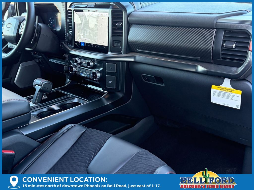 This Ford F-150 is equipped with the following options: Equipment Group 802A Raptor 37 (Carbon Fiber Interior Appliques, Dual Valve Shocks, Modular Front Bumper, RECARO Alcantara Suede Front Seats, and Wheels: Raptor 37 Unique 17" Cast Aluminum), 4WD, 14 Speakers, 17" Cast Aluminum Wheels, 4-Wheel Disc Brakes, ABS brakes, Adjustable pedals, Air Conditioning, Alloy wheels, AM/FM radio: SiriusXM with 360L, Auto High-beam Headlights, Auto tilt-away steering wheel, Auto-dimming door mirrors, Auto-dimming Rear-View mirror, Automatic temperature control, Brake assist, Bumpers: body-color, Compass, Delay-off headlights, Driver door bin, Driver vanity mirror, Dual front impact airbags, Dual front side impact airbags, Electronic Locking w/4.10 Axle Ratio, Electronic Stability Control, Emergency communication system: SYNC 4 911 Assist, Front anti-roll bar, Front Bucket Seats, Front Center Armrest, Front dual zone A/C, Front fog lights, Front reading lights, Front wheel independent suspension, Fully automatic headlights, Garage door transmitter, Heads-Up Display, Heated door mirrors, Heated front seats, Heated rear seats, Heated steering wheel, Illuminated entry, Lane Departure Warning System, Leather steering wheel, Leather Trimmed Seats, Low tire pressure warning, Memory seat, Navigation system: Connected Navigation, Occupant sensing airbag, Outside temperature display, Overhead airbag, Overhead console, Panic alarm, Passenger door bin, Passenger vanity mirror, Pedal memory, Power door mirrors, Power driver seat, Power passenger seat, Power steering, Power windows, Radio data system, Radio: B&O Unleashed Sound System by Bang & Olufsen, Rain sensing wipers, Rear reading lights, Rear step bumper, Rear window defroster, Remote keyless entry, Security system, Speed control, Speed-sensing steering, Split folding rear seat, Steering wheel memory, Steering wheel mounted audio controls, SYNC 4 w/Enhanced Voice Recognition, Tachometer, Telescoping steering wheel, Tilt steering wheel, Tough Bed Spray-In Bedliner, Traction control, Trip computer, Turn signal indicator mirrors, Twin Panel Moonroof, Variably intermittent wipers, and Ventilated front seats.