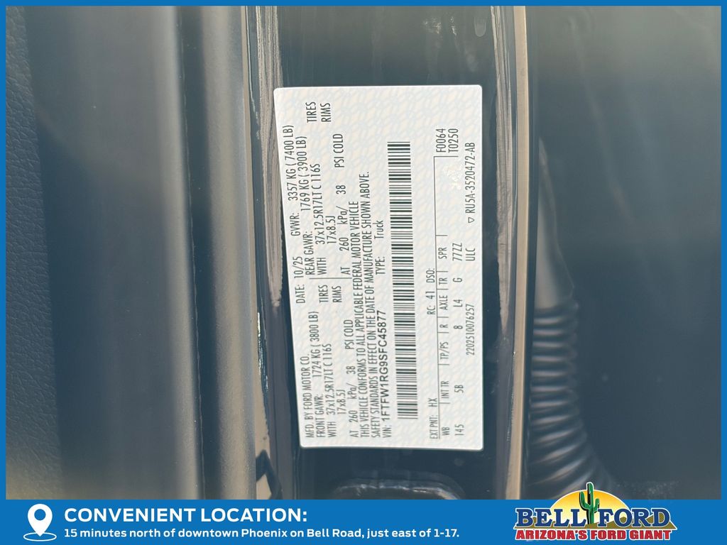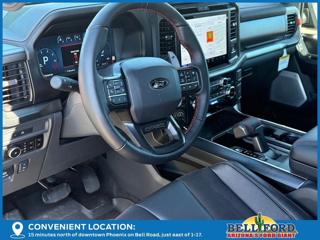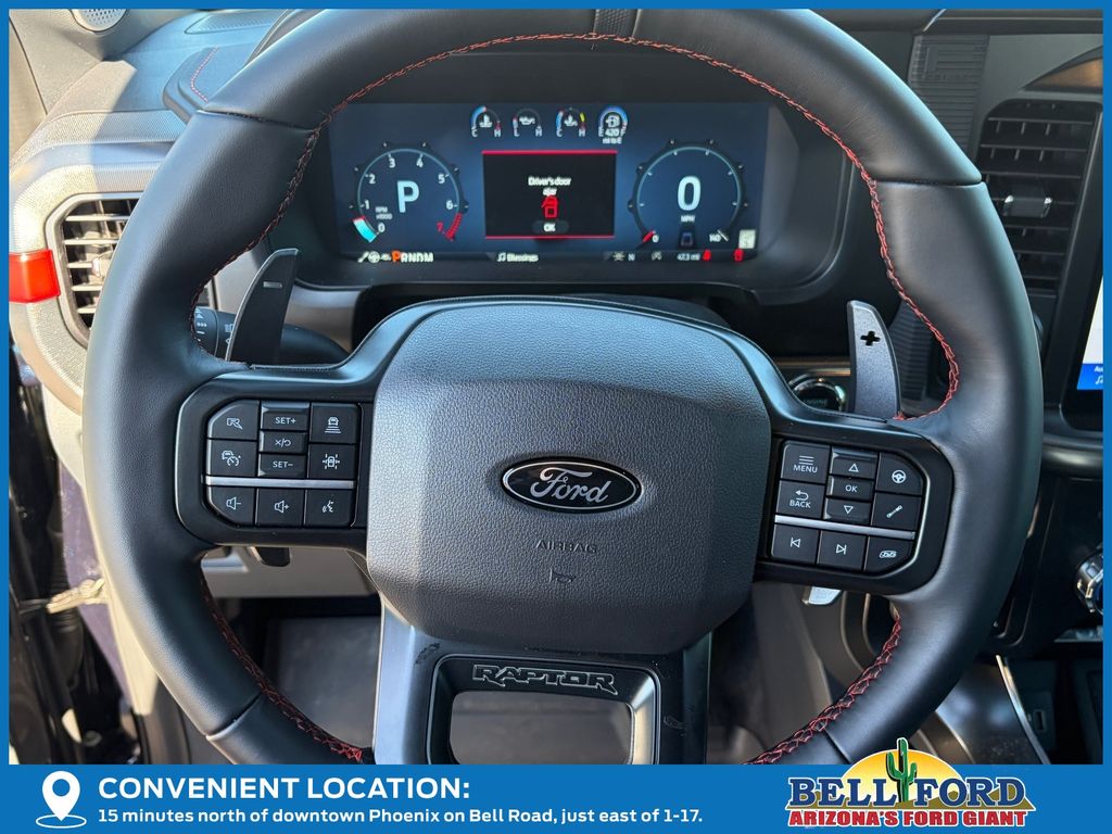 This Ford F-150 is equipped with the following options: Equipment Group 802A Raptor 37 (Carbon Fiber Interior Appliques, Dual Valve Shocks, Modular Front Bumper, RECARO Alcantara Suede Front Seats, and Wheels: Raptor 37 Unique 17" Cast Aluminum), 4WD, 14 Speakers, 17" Cast Aluminum Wheels, 4-Wheel Disc Brakes, ABS brakes, Adjustable pedals, Air Conditioning, Alloy wheels, AM/FM radio: SiriusXM with 360L, Auto High-beam Headlights, Auto tilt-away steering wheel, Auto-dimming door mirrors, Auto-dimming Rear-View mirror, Automatic temperature control, Brake assist, Bumpers: body-color, Compass, Delay-off headlights, Driver door bin, Driver vanity mirror, Dual front impact airbags, Dual front side impact airbags, Electronic Locking w/4.10 Axle Ratio, Electronic Stability Control, Emergency communication system: SYNC 4 911 Assist, Front anti-roll bar, Front Bucket Seats, Front Center Armrest, Front dual zone A/C, Front fog lights, Front License Plate Bracket, Front reading lights, Front wheel independent suspension, Fully automatic headlights, Garage door transmitter, Heads-Up Display, Heated door mirrors, Heated front seats, Heated rear seats, Heated steering wheel, Illuminated entry, Internet access capable: FordPass Connect 5G, Lane Departure Warning System, Leather steering wheel, Leather Trimmed Seats, Low tire pressure warning, Memory seat, Navigation system: Connected Navigation, Occupant sensing airbag, Outside temperature display, Overhead airbag, Overhead console, Panic alarm, Passenger door bin, Passenger vanity mirror, Pedal memory, Power door mirrors, Power driver seat, Power passenger seat, Power steering, Power windows, Radio data system, Radio: B&O Unleashed Sound System by Bang & Olufsen, Rain sensing wipers, Rear reading lights, Rear step bumper, Rear window defroster, Remote keyless entry, Security system, Speed control, Speed-sensing steering, Split folding rear seat, Steering wheel memory, Steering wheel mounted audio controls, SYNC 4 w/Enhanced Voice Recognition, Tachometer, Telescoping steering wheel, Tilt steering wheel, Tough Bed Spray-In Bedliner, Traction control, Trip computer, Turn signal indicator mirrors, Twin Panel Moonroof, Variably intermittent wipers, and Ventilated front seats.