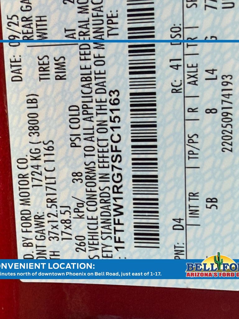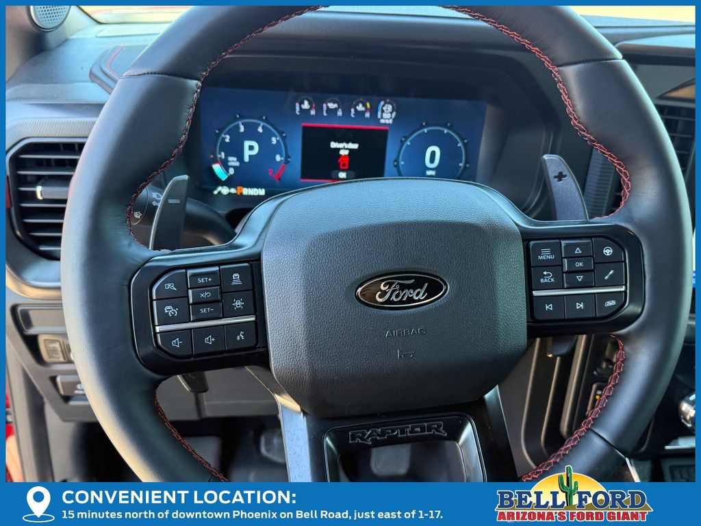 This Ford F-150 is equipped with the following options: Equipment Group 802A Raptor 37 (Carbon Fiber Interior Appliques, Dual Valve Shocks, Modular Front Bumper, RECARO Alcantara Suede Front Seats, and Wheels: Raptor 37 Unique 17" Cast Aluminum), 4WD, 14 Speakers, 17" Cast Aluminum Wheels, 4-Wheel Disc Brakes, ABS brakes, Adjustable pedals, Air Conditioning, Alloy wheels, AM/FM radio: SiriusXM with 360L, Auto High-beam Headlights, Auto tilt-away steering wheel, Auto-dimming door mirrors, Auto-dimming Rear-View mirror, Automatic temperature control, Brake assist, Bumpers: body-color, Compass, Delay-off headlights, Driver door bin, Driver vanity mirror, Dual front impact airbags, Dual front side impact airbags, Electronic Locking w/4.10 Axle Ratio, Electronic Stability Control, Emergency communication system: SYNC 4 911 Assist, Front anti-roll bar, Front Bucket Seats, Front Center Armrest, Front dual zone A/C, Front fog lights, Front License Plate Bracket, Front reading lights, Front wheel independent suspension, Fully automatic headlights, Garage door transmitter, Heads-Up Display, Heated door mirrors, Heated front seats, Heated rear seats, Heated steering wheel, Illuminated entry, Internet access capable: FordPass Connect 5G, Lane Departure Warning System, Leather steering wheel, Leather Trimmed Seats, Low tire pressure warning, Memory seat, Navigation system: Connected Navigation, Occupant sensing airbag, Outside temperature display, Overhead airbag, Overhead console, Panic alarm, Passenger door bin, Passenger vanity mirror, Pedal memory, Power door mirrors, Power driver seat, Power passenger seat, Power steering, Power windows, Radio data system, Radio: B&O Unleashed Sound System by Bang & Olufsen, Rain sensing wipers, Rear reading lights, Rear step bumper, Rear window defroster, Remote keyless entry, Security system, Speed control, Speed-sensing steering, Split folding rear seat, Steering wheel memory, Steering wheel mounted audio controls, SYNC 4 w/Enhanced Voice Recognition, Tachometer, Telescoping steering wheel, Tilt steering wheel, Tough Bed Spray-In Bedliner, Traction control, Trip computer, Turn signal indicator mirrors, Twin Panel Moonroof, Variably intermittent wipers, and Ventilated front seats.