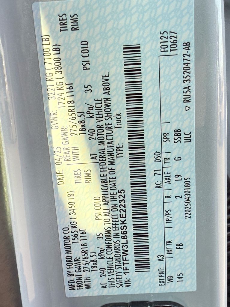 This Ford F-150 is equipped with the following options: Bed Utility Package (4 Pickup Box Tie-Down Plates, LED Box Lighting, and Tailgate Step w/Tailgate Work Surface), Equipment Group 302A Mid, Tow/Haul Package, 4WD, 4-Wheel Disc Brakes, 6 Speakers, ABS brakes, Air Conditioning, Alloy wheels, AM/FM radio: SiriusXM with 360L, Auto High-beam Headlights, Brake assist, Bumpers: chrome, Chrome wheels, Cloth 40/20/40 Front Seat, Compass, Delay-off headlights, Driver door bin, Driver vanity mirror, Dual front impact airbags, Dual front side impact airbags, Electronic Stability Control, Emergency communication system: SYNC 4 911 Assist, Front anti-roll bar, Front Center Armrest, Front fog lights, Front reading lights, Front wheel independent suspension, Fully automatic headlights, Heated door mirrors, Illuminated entry, Low tire pressure warning, Occupant sensing airbag, Outside temperature display, Overhead airbag, Overhead console, Panic alarm, Passenger door bin, Passenger vanity mirror, Power door mirrors, Power steering, Power windows, Radio data system, Radio: AM/FM Stereo w/SiriusXM 360L, Rear Parking Sensors, Rear reading lights, Rear step bumper, Rear window defroster, Remote keyless entry, Security system, Speed control, Split folding rear seat, Steering wheel mounted audio controls, SYNC 4 w/Enhanced Voice Recognition, Tachometer, Telescoping steering wheel, Tilt steering wheel, Traction control, Trip computer, Variably intermittent wipers, Voltmeter, and Wheels: 18" Chrome-Like PVD. Price includes: $1500 - Retail Bonus Cash. Exp. 01/05/2026