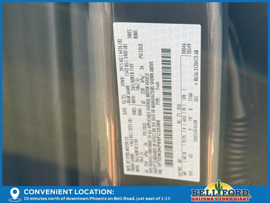 This Ford F-150 is equipped with the following options: Equipment Group 302A Mid (360 Degree Camera, 400W Cab & Bed Outlets, 6" Angular Bright Anodized Step Bar, Adaptive Cruise Control w/Stop & Go, Auto-Dimming Rear-View Mirror, Black Painted Grille w/Chrome Center Bar, Chrome Door & Tailgate Handles, Chrome Single-Tip Exhaust, Cloth 40/Console/40 Front Seats, Connected Navigation, Driver State Detection, Dual-Zone Electronic Automatic Temperature Control, Evasive Steering Assist, Ford Co-Pilot360 Assist 2.0, Front Parking Sensors, Heated Front Seats, Intelligent Access w/Push Button Start, Power Glass Heated Sideview Mirrors, Power-Sliding Rear Window, Remote Start System w/Remote Tailgate Release, Towing Technology, and Wrapped Steering Wheel), GVWR: 6,426 lbs Payload Package, 3.55 Axle Ratio, 4-Wheel Disc Brakes, 6 Speakers, ABS brakes, Air Conditioning, Alloy wheels, AM/FM radio: SiriusXM with 360L, Auto High-beam Headlights, Brake assist, Bumpers: chrome, Cloth 40/20/40 Front Seat, Compass, Delay-off headlights, Driver door bin, Driver vanity mirror, Dual front impact airbags, Dual front side impact airbags, Electronic Stability Control, Emergency communication system: SYNC 4 911 Assist, First Aid Kit w/Ford Logo, Front anti-roll bar, Front Center Armrest, Front fog lights, Front reading lights, Front wheel independent suspension, Fully automatic headlights, Heated door mirrors, Illuminated entry, Low tire pressure warning, Occupant sensing airbag, Outside temperature display, Overhead airbag, Overhead console, Panic alarm, Passenger door bin, Passenger vanity mirror, Power door mirrors, Power steering, Power windows, Radio data system, Radio: AM/FM Stereo w/SiriusXM 360L, Rear Parking Sensors, Rear reading lights, Rear step bumper, Rear window defroster, Remote keyless entry, Security system, Speed control, Split folding rear seat, Steering wheel mounted audio controls, SYNC 4 w/Enhanced Voice Recognition, Tachometer, Telescoping steering wheel, Tilt steering wheel, Traction control, Trip computer, Variably intermittent wipers, Voltmeter, and Wheels: 17" Silver Painted Aluminum. Price includes: $1250 - Retail Bonus Cash. Exp. 01/05/2026 $1500 - Retail Bonus Cash. Exp. 01/05/2026
