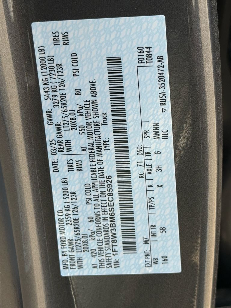 This Ford F-350SD is equipped with the following options: Black Appearance Package (6" Ebony Black Angular Running Boards, Black Painted Front Grille Surround, Body Color Front and Rear Bumpers, and Ebony Black Painted Mirror Caps), FX4 Off-Road Package (Hill Descent Control, Off-Road Specifically Tuned Shock Absorbers, and Unique FX4 Off-Road Box Decal), Lariat Ultimate Package (4-Way Adjustable Headrests, Head-Up Display, Power-Deployable Running Boards, Power-Sliding Rear-Window with Defrost, Privacy Glass, Pro Trailer Backup Assist, Pro Trailer Hitch Assist, Radio: B&O Unleashed Sound System by Bang & Olufsen, SiriusXM Radio with 360L, SYNC 4 with Enhanced Voice Recognition, and Tailgate Step and Handle), Order Code 618A (Flow-Through Console, Front ActiveX Trimmed 40/Console/40 Seats, Radio: B&O Sound System by Bang and Olufsen, and Wheels: 18" Bright Machined and Carbonized Gray Aluminum), 4WD, 190 Amp Alternator, 4-Wheel Disc Brakes, 410 Amp Dual Alternators, 8 Speakers, ABS brakes, Adaptive Cruise Control with Stop-and-Go, Adjustable pedals, Air Conditioning, Alloy wheels, AM/FM radio: SiriusXM with 360L, Auto High-beam Headlights, Auto-dimming Rear-View mirror, Automatic High Beam, Automatic temperature control, BLIS with Cross-Traffic Alert, Brake assist, Bumpers: chrome, Compass, Delay-off headlights, Driver door bin, Driver vanity mirror, Dual AGM 68 AH Battery, Dual front impact airbags, Dual front side impact airbags, Electronic Stability Control, Emergency communication system: SYNC 4 911 Assist, Engine Block Heater, Front and Rear Parking Sensors, Front anti-roll bar, Front Bucket Seats, Front Center Armrest, Front dual zone A/C, Front fog lights, Front reading lights, Fully automatic headlights, Garage door transmitter, Heated door mirrors, Heated front seats, Heated rear seats, Heated steering wheel, Illuminated entry, Lane-Keeping System, Low tire pressure warning, Memory seat, Navigation System, Outside temperature display, Overhead airbag, Overhead console, Panic alarm, Passenger door bin, Passenger vanity mirror, Pedal memory, Post-Collision Braking, Power door mirrors, Power driver seat, Power passenger seat, Power steering, Power windows, Pre-Collision Assist, Rain sensing wipers, Rapid-Heat Supplemental Cab Heater, Rear Parking Sensors, Rear reading lights, Rear seat center armrest, Rear step bumper, Rear window defroster, Remote keyless entry, Security system, Speed control, Split folding rear seat, Steering wheel mounted audio controls, Tachometer, Telescoping steering wheel, Tilt steering wheel, Traction control, Trip computer, Turn signal indicator mirrors, Twin Panel Power Moonroof, Upfitter Switches (6), Variably intermittent wipers, and Ventilated front seats.