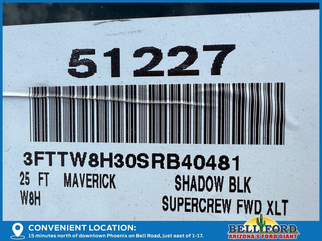 This Ford Maverick is equipped with the following options: Equipment Group 300A, XLT Luxury Package (400W Inverter w/USB Console Rear, Heated Mirror w/Painted Black Skull Caps, Heated Seats, LED Box Lighting, Remote Start System, and Soft Vinyl Wrapped Heated Steering Wheel), 2.5L I-4 Hybrid, 2.91 Axle Ratio, 4-Wheel Disc Brakes, 6 Speakers, ABS brakes, Air Conditioning, Alloy wheels, AM/FM radio: SiriusXM with 360L, Apple CarPlay/Android Auto, Auto High Beams, Auto High-beam Headlights, Automatic temperature control, Brake assist, Bumpers: body-color, Compass, Delay-off headlights, Driver door bin, Driver vanity mirror, Dual front impact airbags, Dual front side impact airbags, Electronic Stability Control, Emergency communication system: SYNC 4 911 Assist, Exterior Parking Camera Rear, Front anti-roll bar, Front Bucket Seats, Front Center Armrest, Front reading lights, Front wheel independent suspension, Fully automatic headlights, Illuminated entry, Internet access capable: FordPass Connect 5G, Knee airbag, Low tire pressure warning, Occupant sensing airbag, Outside temperature display, Overhead airbag, Overhead console, Panic alarm, Passenger door bin, Passenger vanity mirror, Power door mirrors, Power Moonroof, Power steering, Power windows, Pre-Collision Assist w/Automatic Emergency Braking, Radio data system, Radio: AM/FM Stereo w/6 Speakers, Rear anti-roll bar, Rear seat center armrest, Rear step bumper, Rear-View Camera, Remote keyless entry, Security system, SiriusXM w/360L, Speed control, Speed-sensing steering, Steering wheel mounted audio controls, SYNC 4 w/Enhanced Voice Recognition, Telescoping steering wheel, Tilt steering wheel, Traction control, Trip computer, Unique Cloth Front Bucket Seats, and Wheels: 17" Carbonized Gray Painted Aluminum. Price includes: $1000 - Retail Customer Cash. Exp. 04/30/2026