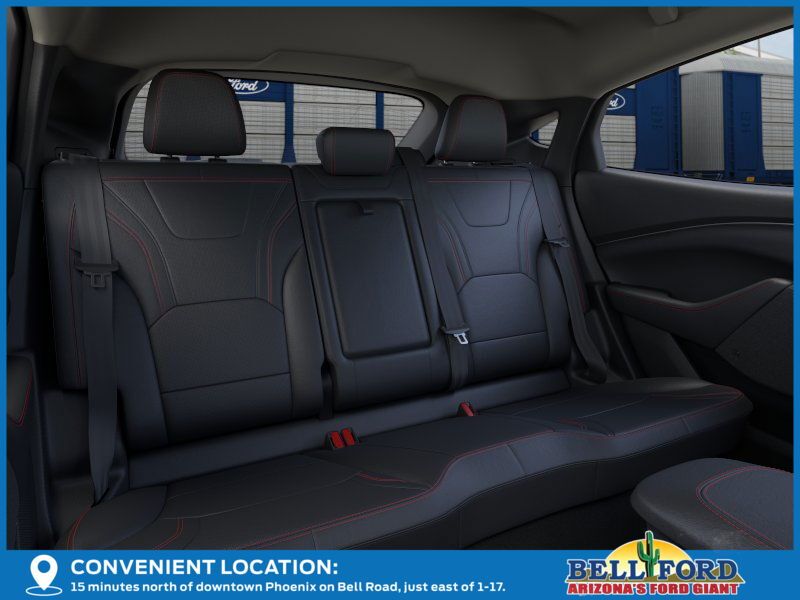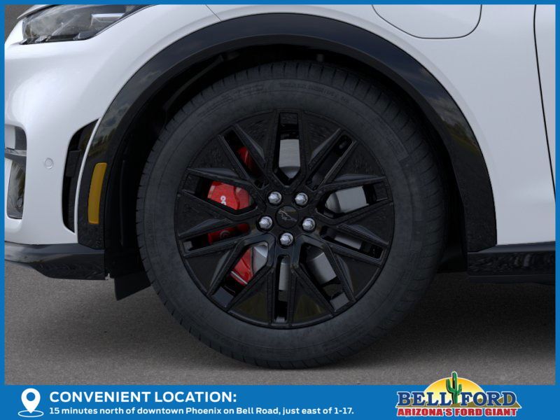 This Ford Mustang Mach-E is equipped with the following options: Equipment Group 300A Standard Package, Sport Appearance Package (Brembo Branded Front Brakes, Red Painted Front & Rear Brake Calipers, Sport Pedals, Unique Front Fascia, and Wheels: 19" Monochromatic High Gloss Black-Painted), 10 Speakers, 4-Wheel Disc Brakes, ABS brakes, Air Conditioning, Alloy wheels, AM/FM radio: SiriusXM with 360L, Apple CarPlay/Android Auto, Auto High-beam Headlights, Auto-dimming Rear-View mirror, Automatic temperature control, Brake assist, Bumpers: body-color, Compass, Delay-off headlights, Driver door bin, Driver vanity mirror, Dual front impact airbags, Dual front side impact airbags, Electronic Stability Control, Emergency communication system: 911 Assist, Exterior Parking Camera Rear, Four wheel independent suspension, Front anti-roll bar, Front Bucket Seats, Front Center Armrest, Front dual zone A/C, Front reading lights, Fully automatic headlights, Garage door transmitter, Heated door mirrors, Heated front seats, Heated steering wheel, Heated/Ventilated Perforated ActiveX Bucket Seats, Illuminated entry, Knee airbag, Low tire pressure warning, Memory seat, Mobile Power Cord (120V/240V), Navigation system: Connected Navigation, Occupant sensing airbag, Outside temperature display, Overhead airbag, Overhead console, Panic alarm, Passenger door bin, Passenger vanity mirror, Power door mirrors, Power driver seat, Power Liftgate, Power passenger seat, Power steering, Power windows, Radio data system, Radio: B&O Sound System by Bang & Olufsen, Rain sensing wipers, Rear anti-roll bar, Rear seat center armrest, Rear side impact airbag, Rear window defroster, Rear window wiper, Remote keyless entry, Security system, SiriusXM w/360L, Speed control, Speed-sensing steering, Speed-Sensitive Wipers, Split folding rear seat, Spoiler, Steering wheel mounted audio controls, SYNC 4A w/Enhanced Voice Recognition, Telescoping steering wheel, Tilt steering wheel, Traction control, Trip computer, Turn signal indicator mirrors, Variably intermittent wipers, Ventilated front seats, and Wheels: 19" Bright Machined-Face Aluminum. Price includes: $3000 - Retail Customer Cash. Exp. 01/05/2026