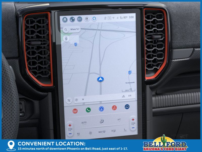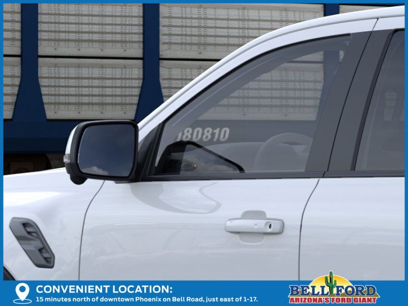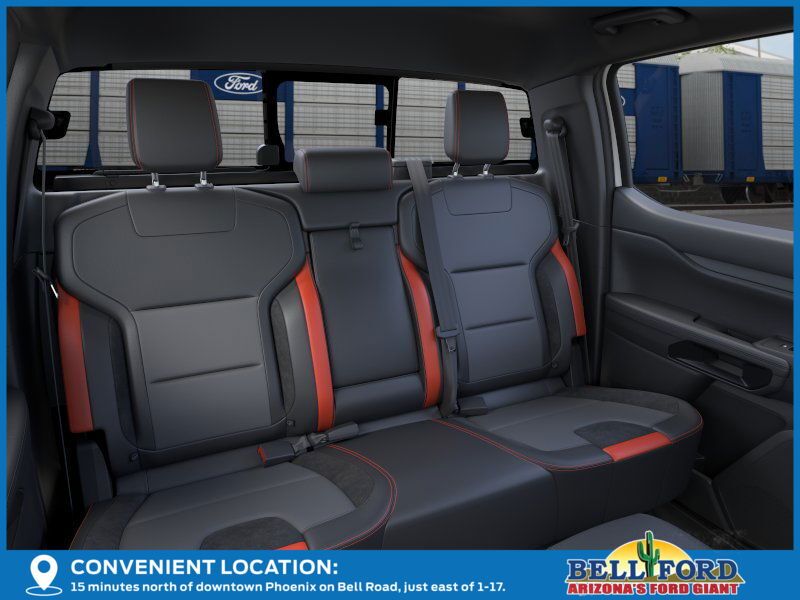 This Ford Ranger is equipped with the following options: Equipment Group 800A Standard, 4WD, 10 Speakers, 4-Wheel Disc Brakes, 4.27 Axle Ratio, ABS brakes, Air Conditioning, Alloy wheels, AM/FM radio: SiriusXM, Auto High-beam Headlights, Auto-dimming Rear-View mirror, Automatic temperature control, Brake assist, Compass, Delay-off headlights, Driver door bin, Driver vanity mirror, Dual front impact airbags, Dual front side impact airbags, Electronic Stability Control, Emergency communication system: SYNC 4 911 Assist, Front anti-roll bar, Front Bucket Seats, Front Center Armrest, Front dual zone A/C, Front fog lights, Front reading lights, Front wheel independent suspension, Fully automatic headlights, Garage door transmitter, Heated door mirrors, Heated front seats, Heated steering wheel, Illuminated entry, Leather Shift Knob, Leather steering wheel, Leather-Trimmed Front Heated Bucket Seats, Low tire pressure warning, Memory seat, Navigation system: Connected Navigation, Occupant sensing airbag, Outside temperature display, Overhead airbag, Overhead console, Panic alarm, Passenger door bin, Passenger vanity mirror, Power door mirrors, Power driver seat, Power passenger seat, Power steering, Power windows, Radio: B&O Sound System by Bang & Olufsen, Rain sensing wipers, Rear reading lights, Rear seat center armrest, Rear step bumper, Rear window defroster, Remote keyless entry, Security system, SiriusXM Satellite Radio, Speed control, Speed-sensing steering, Steering wheel mounted audio controls, SYNC 4A, Telescoping steering wheel, Tilt steering wheel, Traction control, Trip computer, Turn signal indicator mirrors, Variably intermittent wipers, Voltmeter, Wheels: 17" Forged Beadlock Capable, and Wheels: 17" Gray-Painted Aluminum.