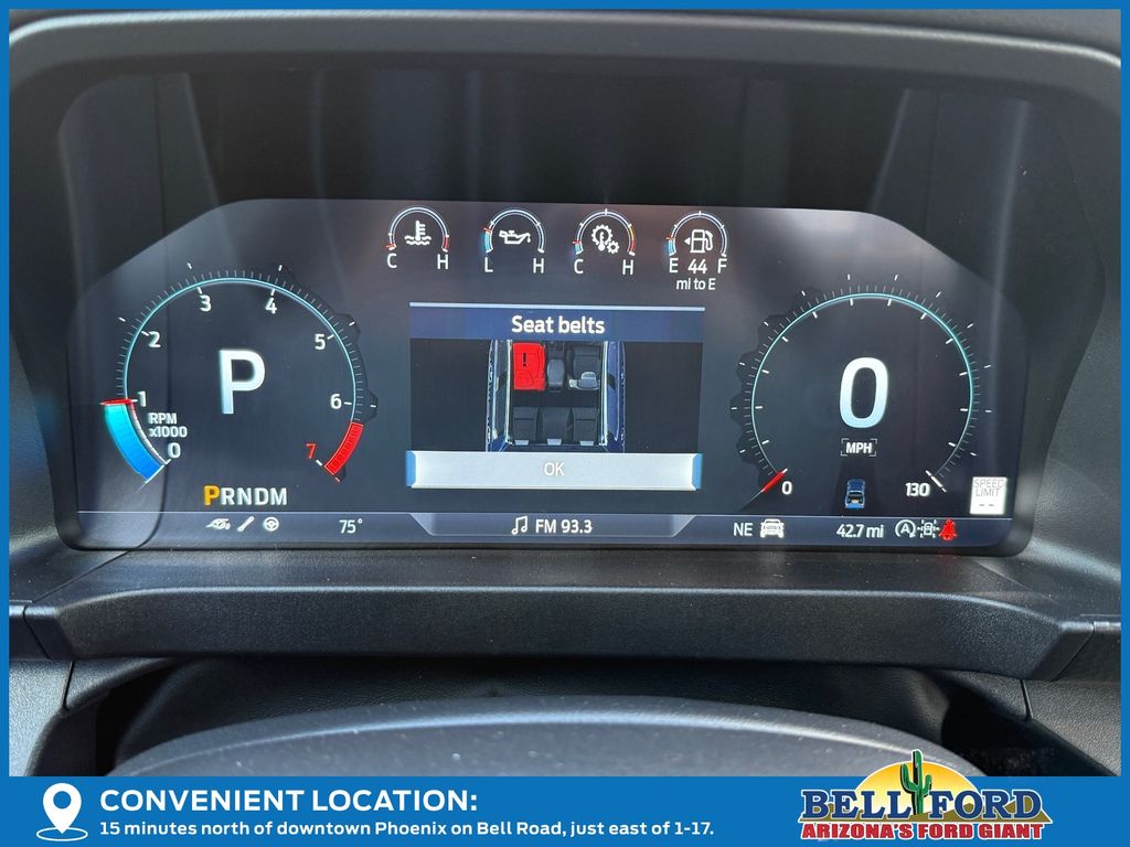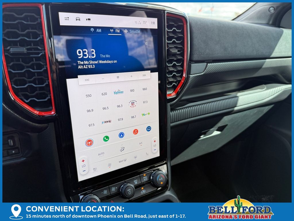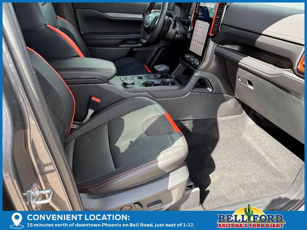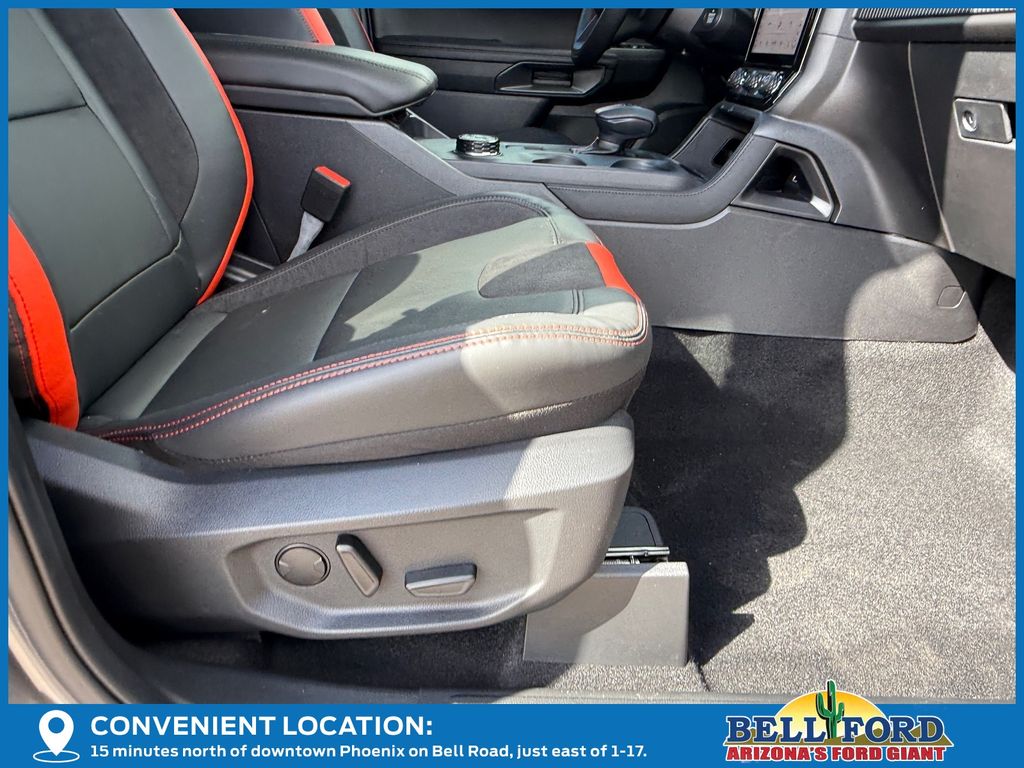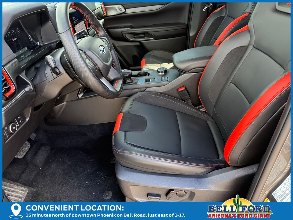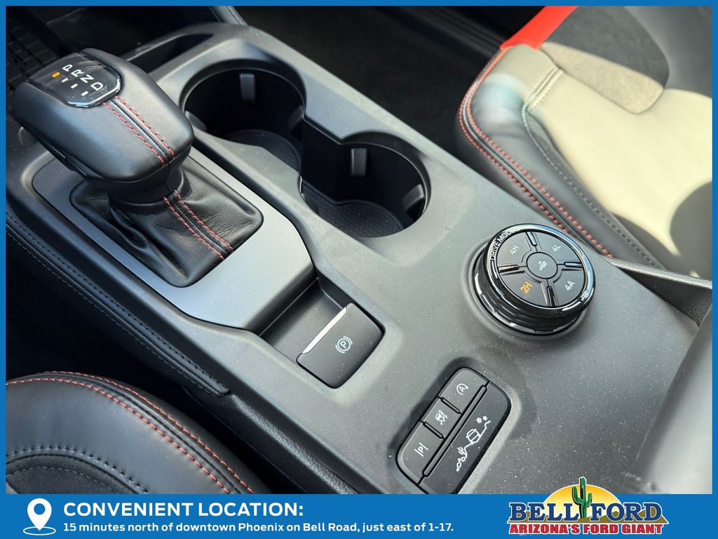 This Ford Ranger is equipped with the following options: Equipment Group 800A Standard, 4WD, 10 Speakers, 4-Wheel Disc Brakes, 4.27 Axle Ratio, ABS brakes, Air Conditioning, Alloy wheels, AM/FM radio: SiriusXM, Auto High-beam Headlights, Auto-dimming Rear-View mirror, Automatic temperature control, Brake assist, Compass, Delay-off headlights, Driver door bin, Driver vanity mirror, Dual front impact airbags, Dual front side impact airbags, Electronic Stability Control, Emergency communication system: SYNC 4 911 Assist, Front anti-roll bar, Front Bucket Seats, Front Center Armrest, Front dual zone A/C, Front fog lights, Front reading lights, Front wheel independent suspension, Fully automatic headlights, Garage door transmitter, Heated door mirrors, Heated front seats, Heated steering wheel, Illuminated entry, Internet access capable: FordPass Connect 4G, Leather Shift Knob, Leather steering wheel, Leather-Trimmed Front Heated Bucket Seats, Low tire pressure warning, Memory seat, Navigation system: Connected Navigation, Occupant sensing airbag, Outside temperature display, Overhead airbag, Overhead console, Panic alarm, Passenger door bin, Passenger vanity mirror, Power door mirrors, Power driver seat, Power passenger seat, Power steering, Power windows, Radio: B&O Sound System by Bang & Olufsen, Rain sensing wipers, Raptor Exterior Graphics, Rear reading lights, Rear seat center armrest, Rear step bumper, Rear window defroster, Remote keyless entry, Security system, SiriusXM Satellite Radio, Speed control, Speed-sensing steering, Steering wheel mounted audio controls, SYNC 4A, Telescoping steering wheel, Tilt steering wheel, Traction control, Trip computer, Turn signal indicator mirrors, Variably intermittent wipers, Voltmeter, Wheels: 17" Forged Beadlock Capable, and Wheels: 17" Gray-Painted Aluminum.