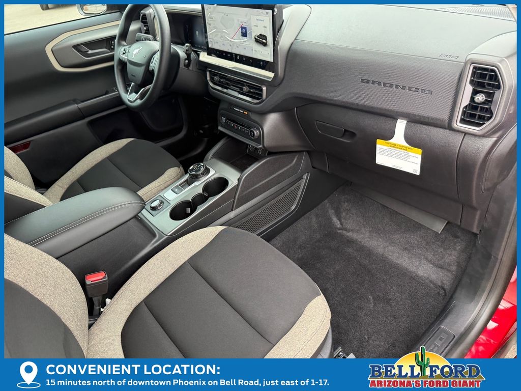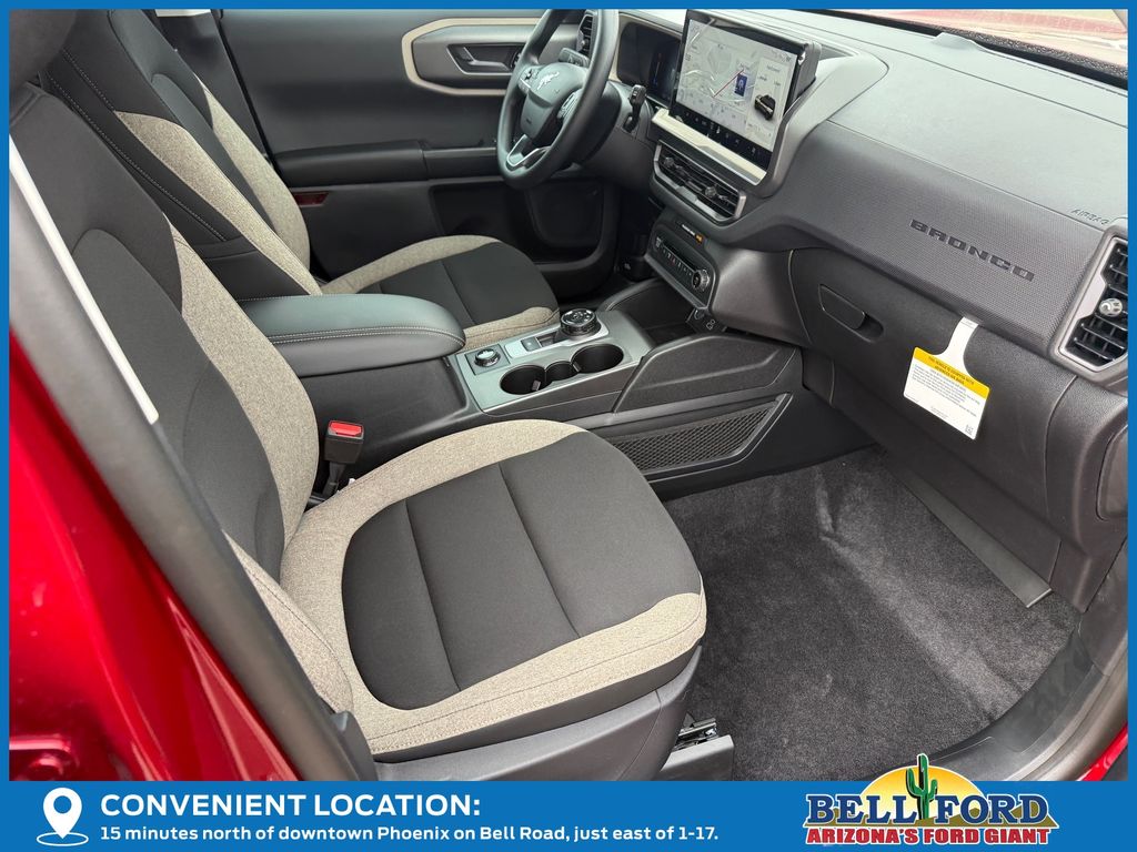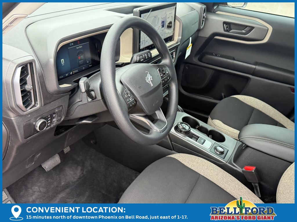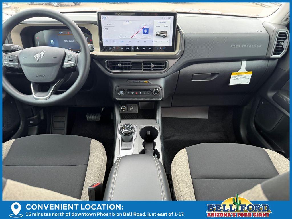 This Ford Bronco Sport is equipped with the following options: Equipment Group 200A Standard Package (AM/FM Stereo, Cloth with Easy-to-Clean Front Bucket Seats, SiriusXM with 360L, SYNC 4 with Enhanced Voice Recognition, and Wheels: 17" Carbonized Gray Painted Aluminum), Ford Connectivity Package (1-Year Included), Internet access capable: 5G Modem - Ford Connectivity Package, 4-Wheel Disc Brakes, 6 Speakers, ABS brakes, Air Conditioning, Alloy wheels, AM/FM radio: SiriusXM with 360L, Apple CarPlay/Android Auto, Auto High-beam Headlights, Automatic temperature control, Brake assist, Compass, Delay-off headlights, Driver door bin, Driver vanity mirror, Dual front impact airbags, Dual front side impact airbags, Electronic Stability Control, Emergency communication system: SYNC 4 911 Assist, Exterior Parking Camera Rear, Four wheel independent suspension, Front anti-roll bar, Front Bucket Seats, Front Center Armrest, Front reading lights, Fully automatic headlights, Heated door mirrors, Illuminated entry, Knee airbag, Low tire pressure warning, Occupant sensing airbag, Outside temperature display, Overhead airbag, Overhead console, Panic alarm, Passenger door bin, Passenger vanity mirror, Power door mirrors, Power steering, Power windows, Radio data system, Rear anti-roll bar, Rear Parking Sensors, Rear reading lights, Rear seat center armrest, Rear window defroster, Rear window wiper, Remote keyless entry, Security system, Speed control, Speed-sensing steering, Speed-Sensitive Wipers, Split folding rear seat, Steering wheel mounted audio controls, Tachometer, Telescoping steering wheel, Tilt steering wheel, Traction control, Trip computer, and Variably intermittent wipers.