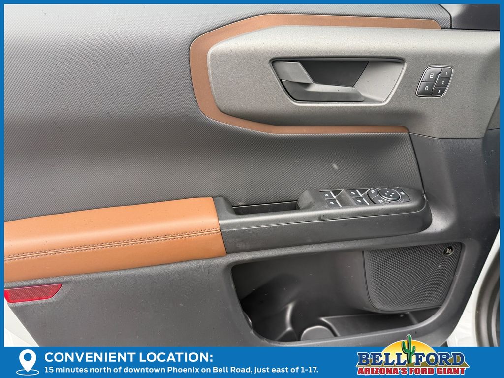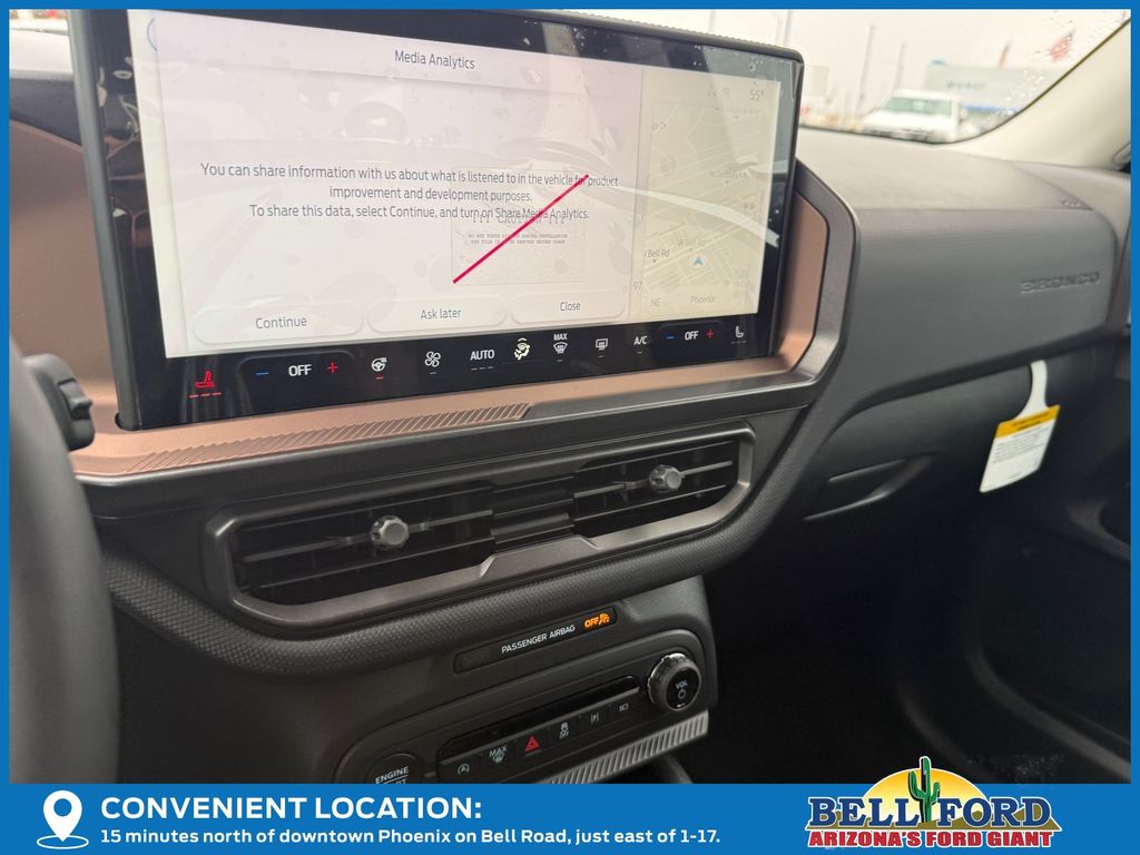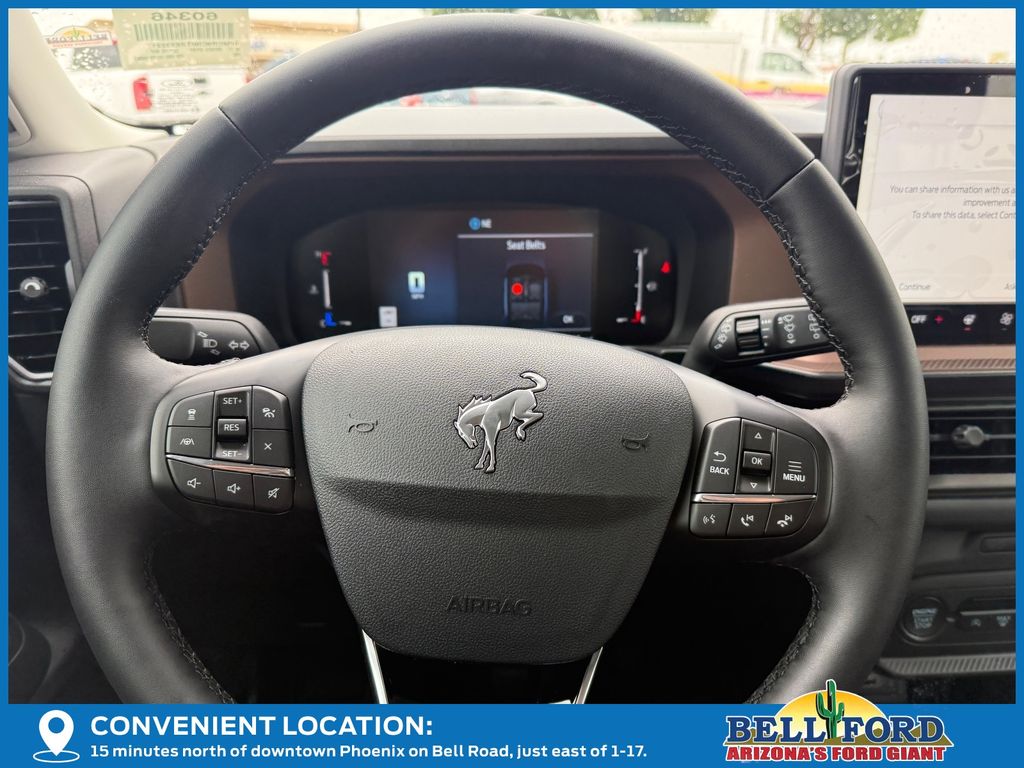 This Ford Bronco Sport is equipped with the following options: Equipment Group 300A Standard Package (AM/FM Stereo, Front Driver/Passenger Seat Back Map Pockets, SiriusXM with 360L, SYNC 4 with Enhanced Voice Recognition, and Wheels: 18" Ebony Black), Ford Connectivity Package (1-Year Included), Internet access capable: 5G Modem - Ford Connectivity Package, Outer Banks Tech Package+ (Connected Navigation (1-Year Included) and Radio: HD w/B&O Sound System by Bang & Olufsen), 360-Degree Camera with Trail View, 4-Wheel Disc Brakes, 6 Speakers, ABS brakes, Air Conditioning, Alloy wheels, AM/FM radio: SiriusXM with 360L, Apple CarPlay/Android Auto, Auto High-beam Headlights, Auto-dimming Rear-View mirror, Automatic temperature control, Brake assist, Compass, Delay-off headlights, Driver door bin, Driver vanity mirror, Dual front impact airbags, Dual front side impact airbags, Electronic Stability Control, Emergency communication system: SYNC 4 911 Assist, Exterior Parking Camera Rear, Four wheel independent suspension, Front anti-roll bar, Front Bucket Seats, Front Center Armrest, Front dual zone A/C, Front fog lights, Front Parking Sensors, Front reading lights, Fully automatic headlights, Heated door mirrors, Heated front seats, Heated steering wheel, Illuminated entry, Knee airbag, Low tire pressure warning, Memory seat, Occupant sensing airbag, Outside temperature display, Overhead airbag, Overhead console, Panic alarm, Passenger door bin, Passenger vanity mirror, Power door mirrors, Power driver seat, Power passenger seat, Power steering, Power windows, Radio data system, Rear anti-roll bar, Rear Parking Sensors, Rear reading lights, Rear seat center armrest, Rear window defroster, Rear window wiper, Remote keyless entry, Reverse Brake Assist, Security system, Speed control, Speed-sensing steering, Speed-Sensitive Wipers, Split folding rear seat, Steering wheel mounted audio controls, Tachometer, Telescoping steering wheel, Tilt steering wheel, Traction control, Trip computer, and Variably intermittent wipers.