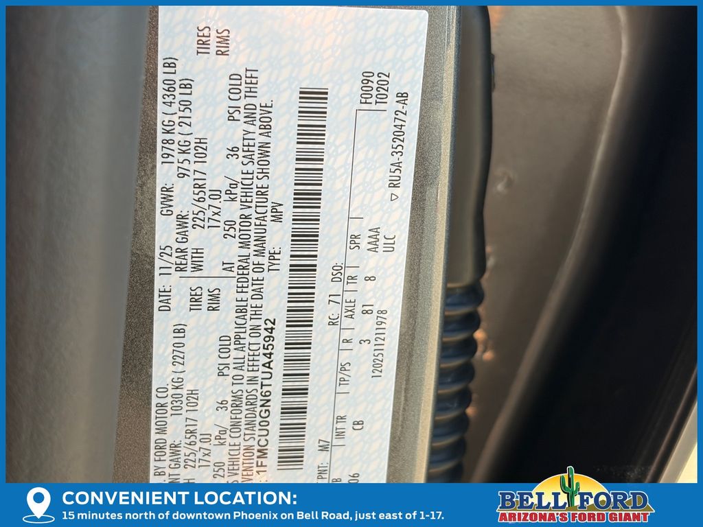 This Ford Escape is equipped with the following options: Equipment Group 200A (3.81 Axle Ratio, 4-Way Manual Front Passenger Seat, 6-Way Manual Driver Seat, Ford App, Radio: AM/FM Stereo with SiriusXM 360L, SYNC 4, Unique Cloth Front Bucket Seats, and Wheels: 17" Shadow Silver-Painted Aluminum), 4-Wheel Disc Brakes, 6 Speakers, ABS brakes, Air Conditioning, Alloy wheels, AM/FM radio: SiriusXM 360L, Auto High-beam Headlights, Automatic temperature control, Brake assist, Bumpers: body-color, Compass, Delay-off headlights, Driver door bin, Driver vanity mirror, Dual front impact airbags, Dual front side impact airbags, Electronic Stability Control, Emergency communication system: SYNC 4 911 Assist, Four wheel independent suspension, Front anti-roll bar, Front Bucket Seats, Front Center Armrest, Front dual zone A/C, Front reading lights, Fully automatic headlights, Illuminated entry, Knee airbag, Low tire pressure warning, Occupant sensing airbag, Outside temperature display, Overhead airbag, Overhead console, Panic alarm, Passenger door bin, Passenger vanity mirror, Power door mirrors, Power steering, Power windows, Radio data system, Rear anti-roll bar, Rear reading lights, Rear seat center armrest, Rear window defroster, Rear window wiper, Remote keyless entry, Speed control, Speed-sensing steering, Speed-Sensitive Wipers, Split folding rear seat, Spoiler, Steering wheel mounted audio controls, Tachometer, Telescoping steering wheel, Tilt steering wheel, Traction control, Trip computer, and Variably intermittent wipers. Price includes: $2000 - Bonus Customer Cash. Exp. 01/05/2026