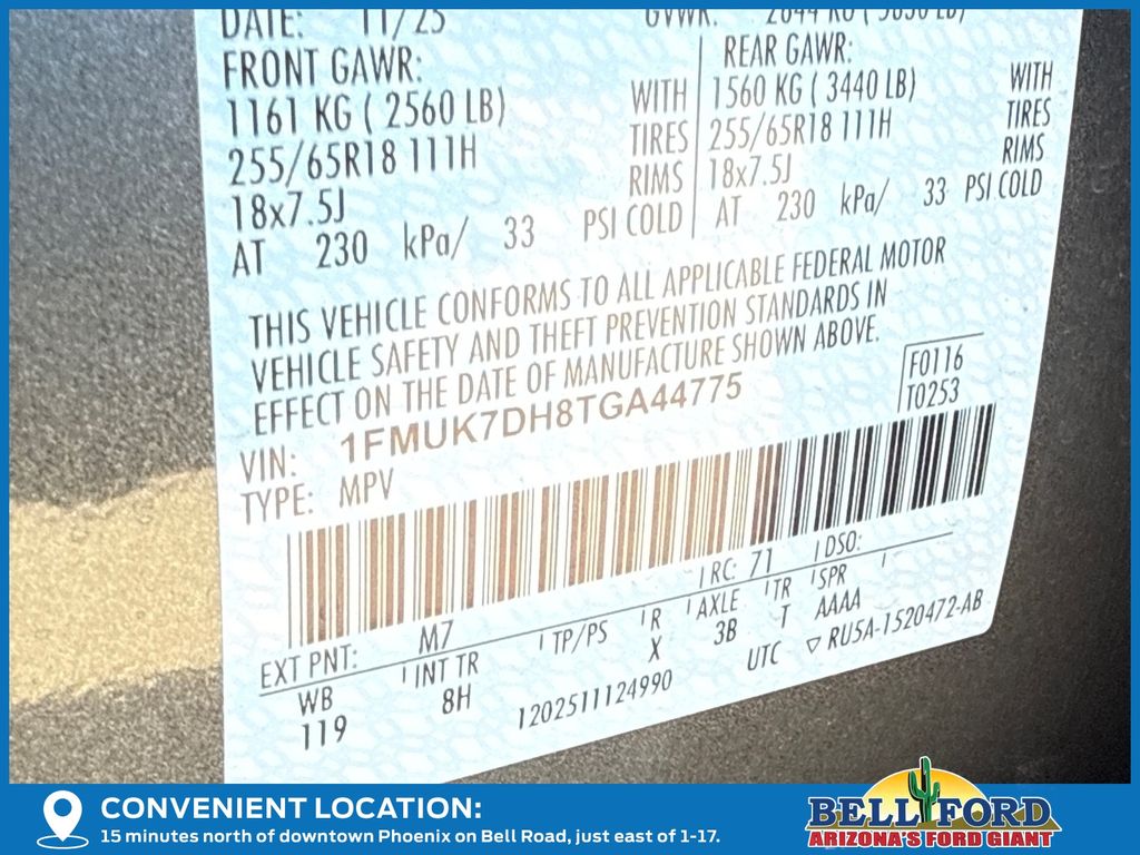 - VIN : 1FMUK7DH8TGA44775