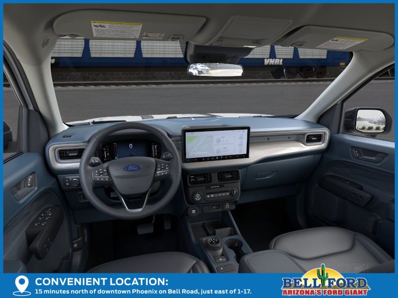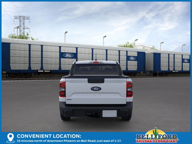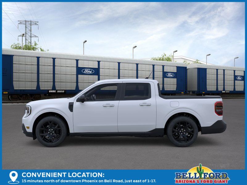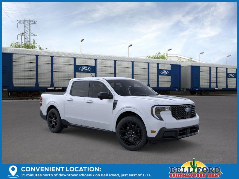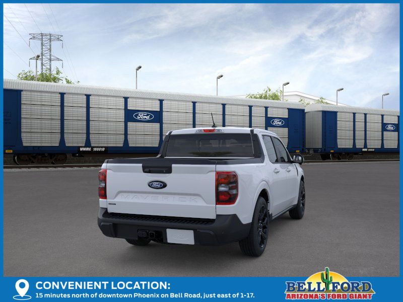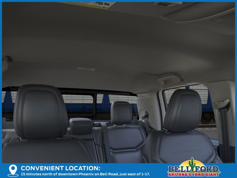 This Ford Maverick is equipped with the following options: 4K Tow Package (Trailer Brake Controller, Trailer Hitch (Class III) 2" Receiver, and Upgraded Cooling Fan), Black Appearance Package (Black Grille, Black Interior Accents, and Wheels: 19" Black Painted Aluminum), Equipment Group 501A, Ford Connectivity Package (1-Year Included), Internet access capable: 5G Modem - Ford Connectivity Package, 2.5L I-4 Hybrid, 2.91 Axle Ratio, 4-Wheel Disc Brakes, 8 Speakers, ABS brakes, ActiveX Trimmed Heated Front Bucket Seats, Air Conditioning, Alloy wheels, AM/FM radio: SiriusXM with 360L, Apple CarPlay/Android Auto, Auto High-beam Headlights, Automatic temperature control, Brake assist, Bumpers: body-color, Compass, Delay-off headlights, Driver door bin, Driver vanity mirror, Dual front impact airbags, Dual front side impact airbags, Electronic Stability Control, Emergency communication system: SYNC 4 911 Assist, Exterior Parking Camera Rear, Four wheel independent suspension, Front anti-roll bar, Front Bucket Seats, Front Center Armrest, Front dual zone A/C, Front reading lights, Fully automatic headlights, Heated door mirrors, Heated front seats, Heated steering wheel, Illuminated entry, Knee airbag, Low tire pressure warning, Navigation system: Connected Navigation, Occupant sensing airbag, Outside temperature display, Overhead airbag, Overhead console, Panic alarm, Passenger door bin, Passenger vanity mirror, Power door mirrors, Power driver seat, Power steering, Power windows, Power-Sliding Rear Window, Radio data system, Radio: B&O Sound System by Bang & Olufsen, Rear anti-roll bar, Rear seat center armrest, Rear step bumper, Remote keyless entry, Security system, SiriusXM w/360L, Speed control, Speed-sensing steering, Steering wheel mounted audio controls, SYNC 4 w/Enhanced Voice Recognition, Telescoping steering wheel, Tilt steering wheel, Traction control, Trip computer, and Wheels: 19" Machined Painted Aluminum.