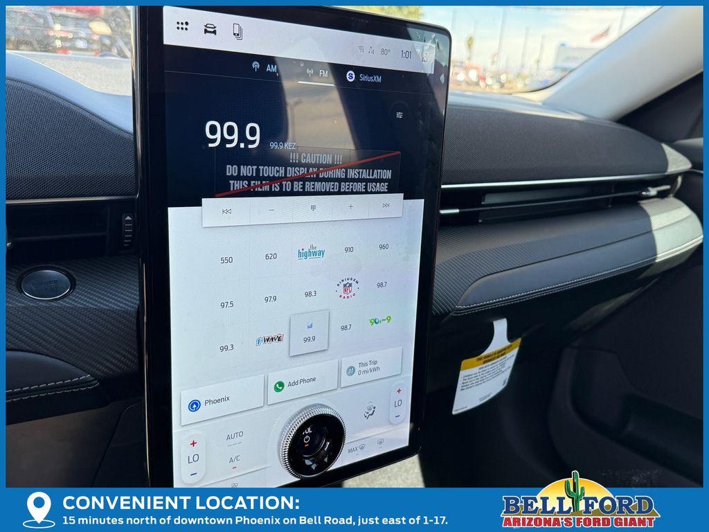 This Ford Mustang Mach-E is equipped with the following options: Equipment Group 100A Standard Package (ActiveX Bucket Seats, AM/FM Stereo, SiriusXM with 360L, SYNC 4A with Enhanced Voice Recognition, and Wheels: 19" Machined-Face Aluminum), 4-Wheel Disc Brakes, 6 Speakers, ABS brakes, Air Conditioning, Alloy wheels, AM/FM radio: SiriusXM with 360L, Apple CarPlay/Android Auto, Auto High-beam Headlights, Auto-dimming Rear-View mirror, Automatic temperature control, Brake assist, Bumpers: body-color, Compass, Delay-off headlights, Driver door bin, Driver vanity mirror, Dual front impact airbags, Dual front side impact airbags, Electronic Stability Control, Emergency communication system: 911 Assist, Exterior Parking Camera Rear, Four wheel independent suspension, Front anti-roll bar, Front Bucket Seats, Front Center Armrest, Front dual zone A/C, Front reading lights, Fully automatic headlights, Heated door mirrors, Illuminated entry, Knee airbag, Low tire pressure warning, Mobile Power Cord (120V/240V), Navigation system: Connected Navigation, Occupant sensing airbag, Outside temperature display, Overhead airbag, Overhead console, Panic alarm, Passenger door bin, Passenger vanity mirror, Power door mirrors, Power driver seat, Power steering, Power windows, Radio data system, Rain sensing wipers, Rear anti-roll bar, Rear seat center armrest, Rear side impact airbag, Rear window defroster, Rear window wiper, Remote keyless entry, Security system, Speed control, Speed-sensing steering, Speed-Sensitive Wipers, Split folding rear seat, Spoiler, Steering wheel mounted audio controls, Telescoping steering wheel, Tilt steering wheel, Tire Inflator and Sealant Kit, Traction control, Trip computer, Turn signal indicator mirrors, Variably intermittent wipers, and Wheels: 19" Monochromatic High Gloss Black-Painted.