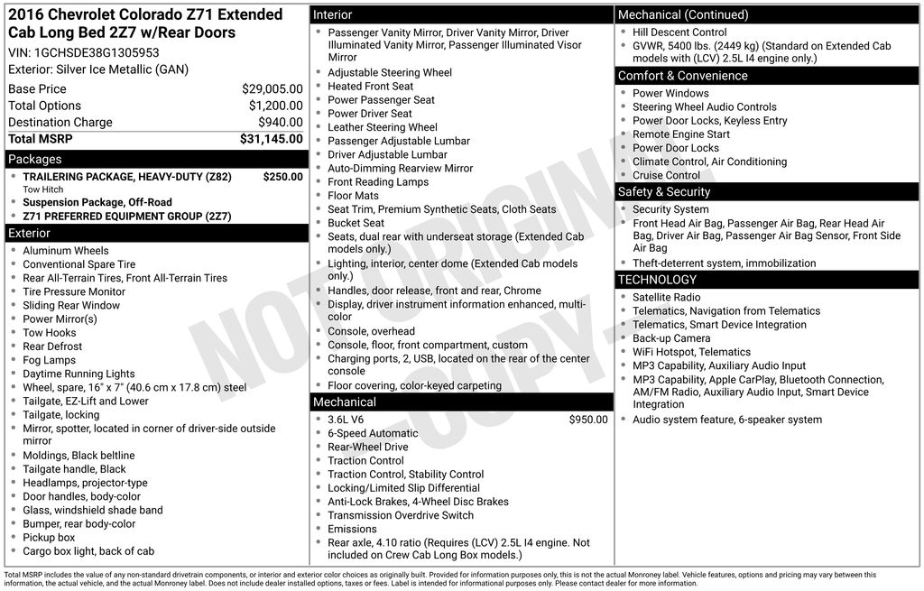 Silver Ice 2016 Chevrolet Colorado Z71 RWD 6-Speed Automatic 3.6L 6-Cylinder DGI DOHC