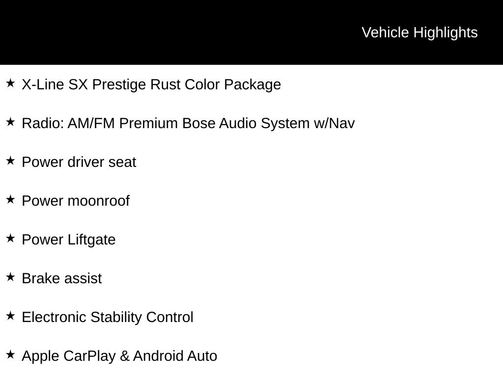 AWD, Apple CarPlay & Android Auto, Brake assist, Electronic Stability Control, Power driver seat, Power Liftgate, Power moonroof, Radio: AM/FM Premium Bose Audio System w/Nav, Wheels: 20" Grey Finish Alloy, X-Line SX Prestige Rust Color Package.