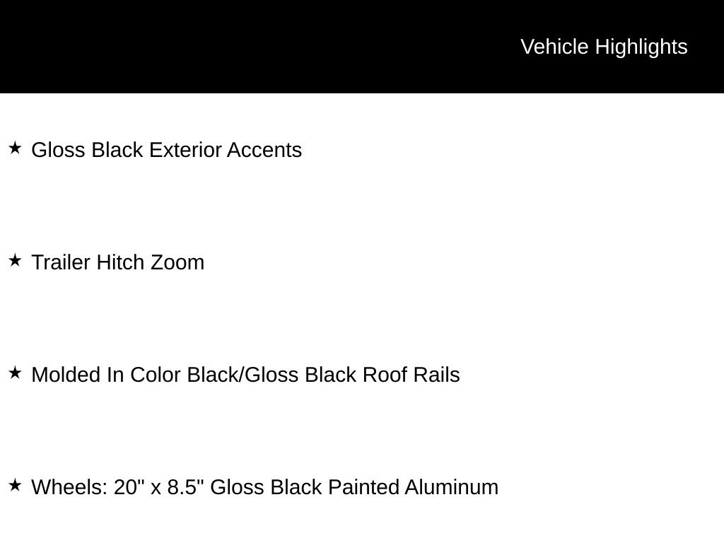 - Wheels: 20" x 8.5" Gloss Black Painted Aluminum