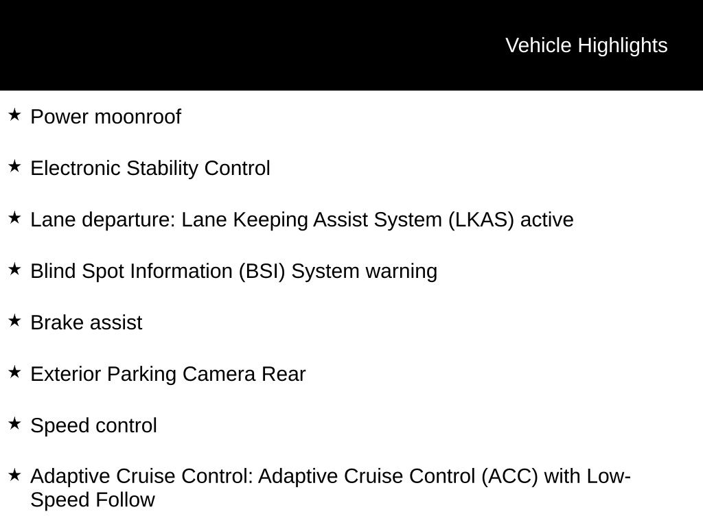 - Adaptive Cruise Control: Adaptive Cruise Control (ACC) with Low-Speed Follow